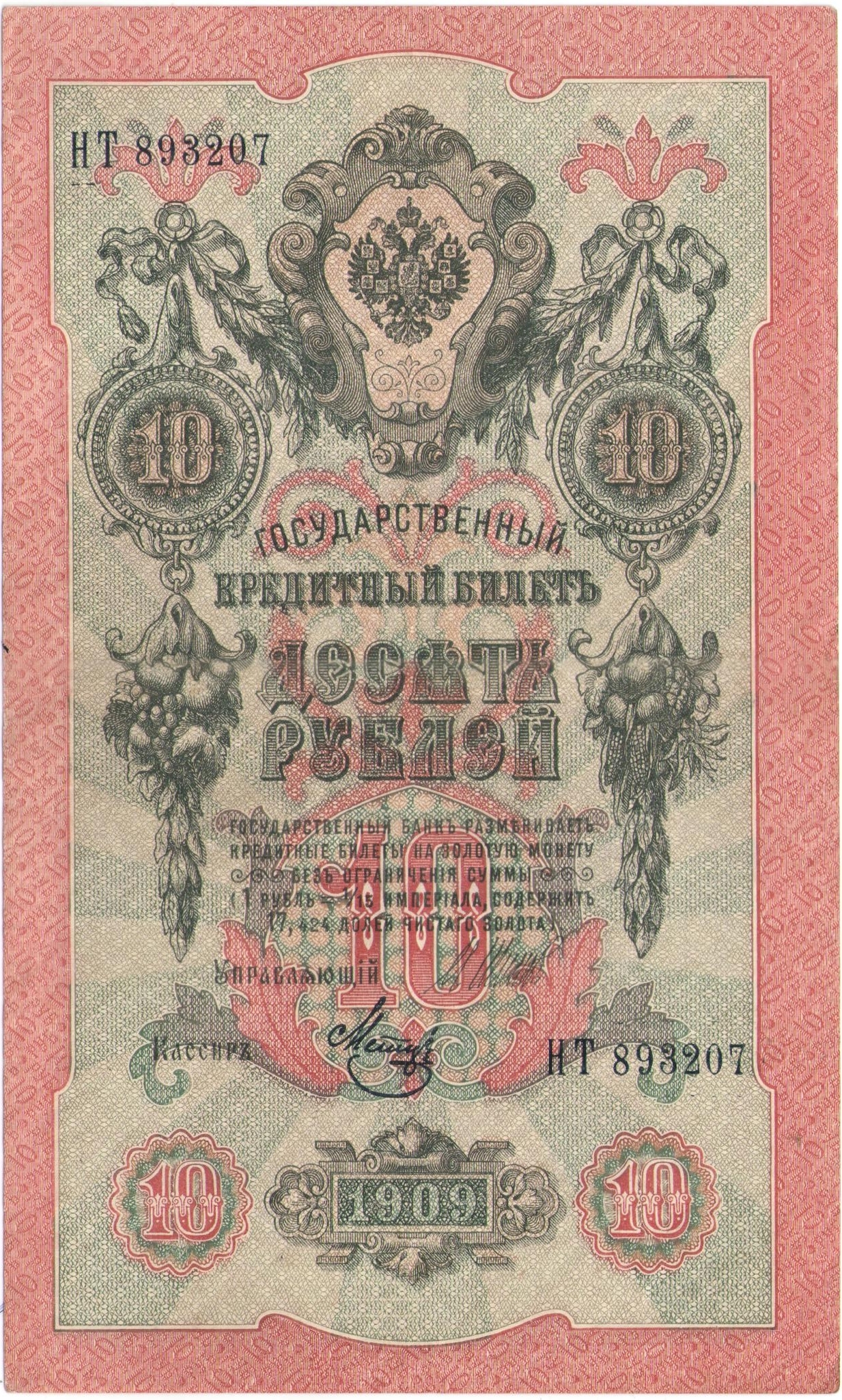 Банкнота 10 рублей 1909 управляющий Шипов, кассир Метц (Временное правительство) в состоянии XF.