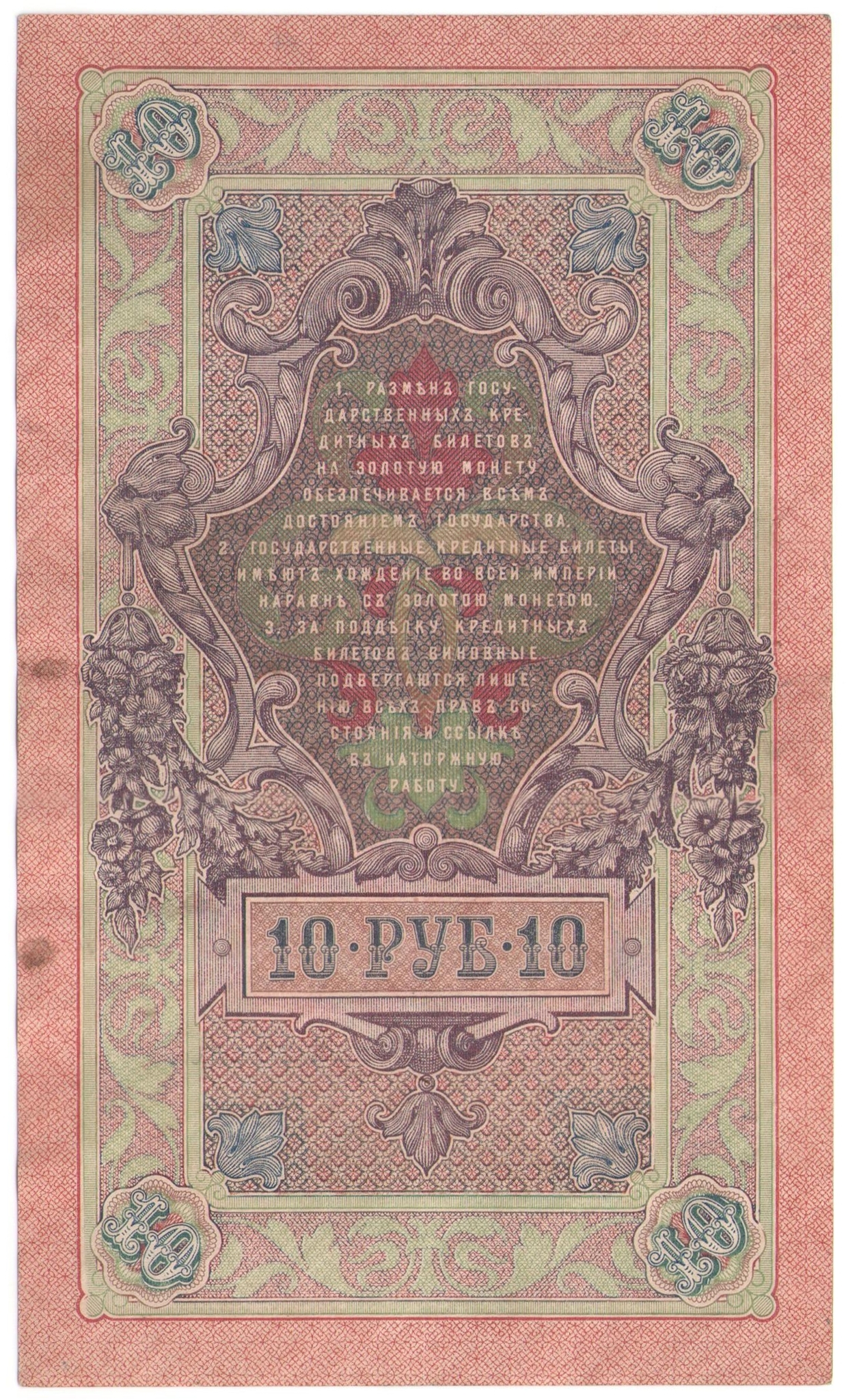 Оборотная сторона: в центре банкноты, поверх красноватого фона, стилизованная рамка, по углам которой цифры "10". По центру извлечение из закона от 14 ноября 1897 года:
