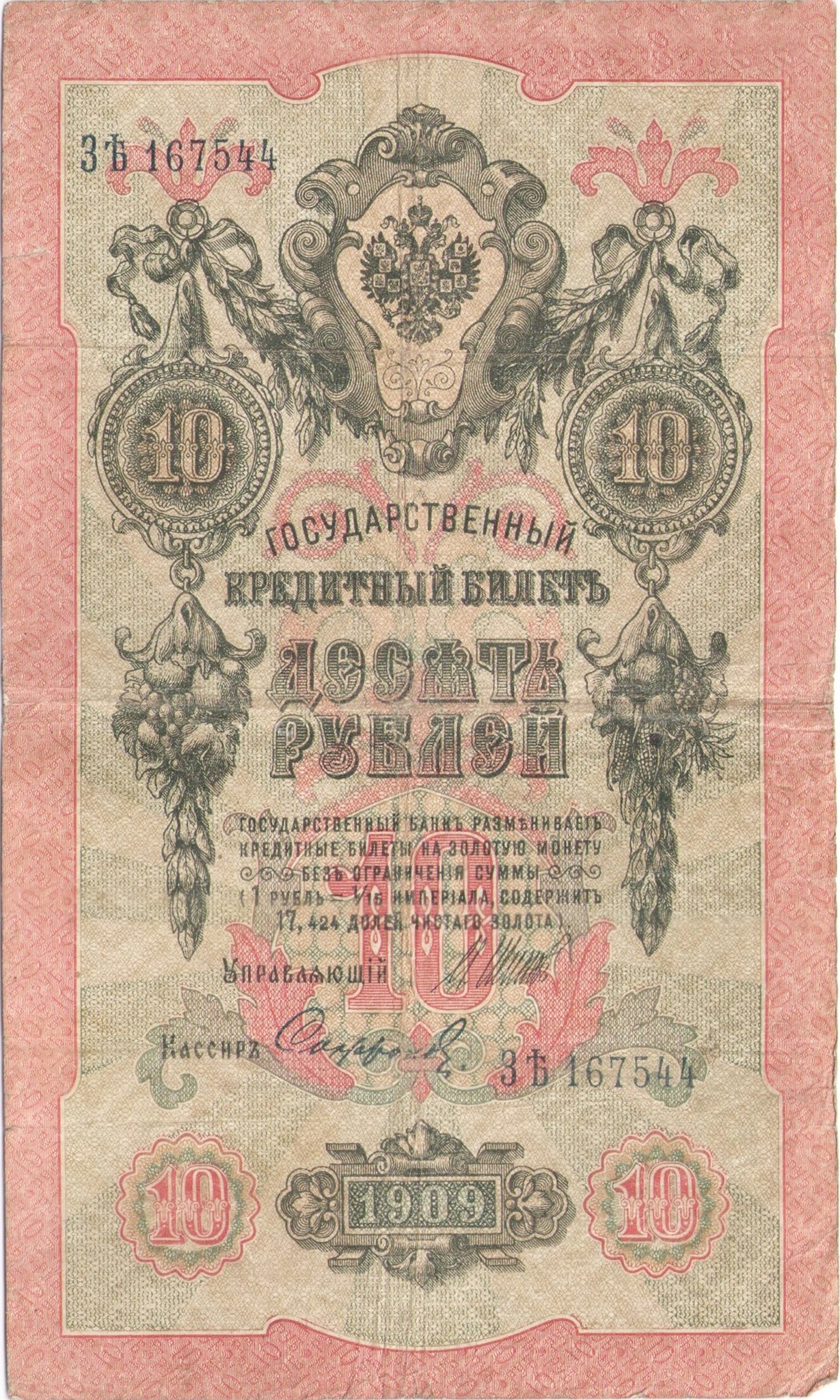 Банкнота 10 рублей 1909 управляющий Шипов, кассир Сафронов (Царское правительство) в состоянии F.