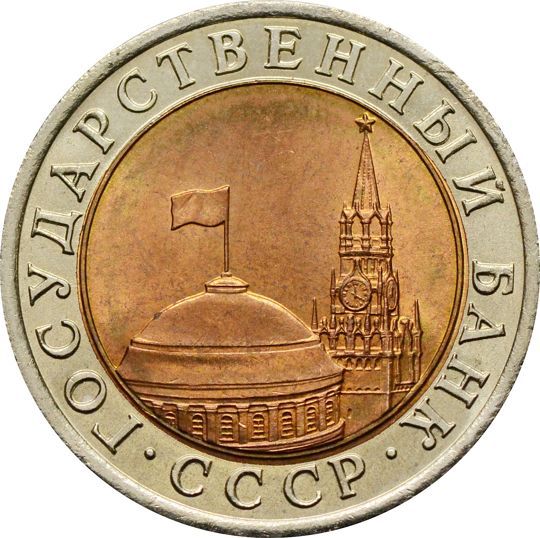 Реверс: в центре монеты указание номинала в две строки: "10 РУБЛЕЙ", под ним знак монетного двора (ЛМД). Снизу у края монеты год чеканки: "1991". Слева колос, справа дубовая ветвь.