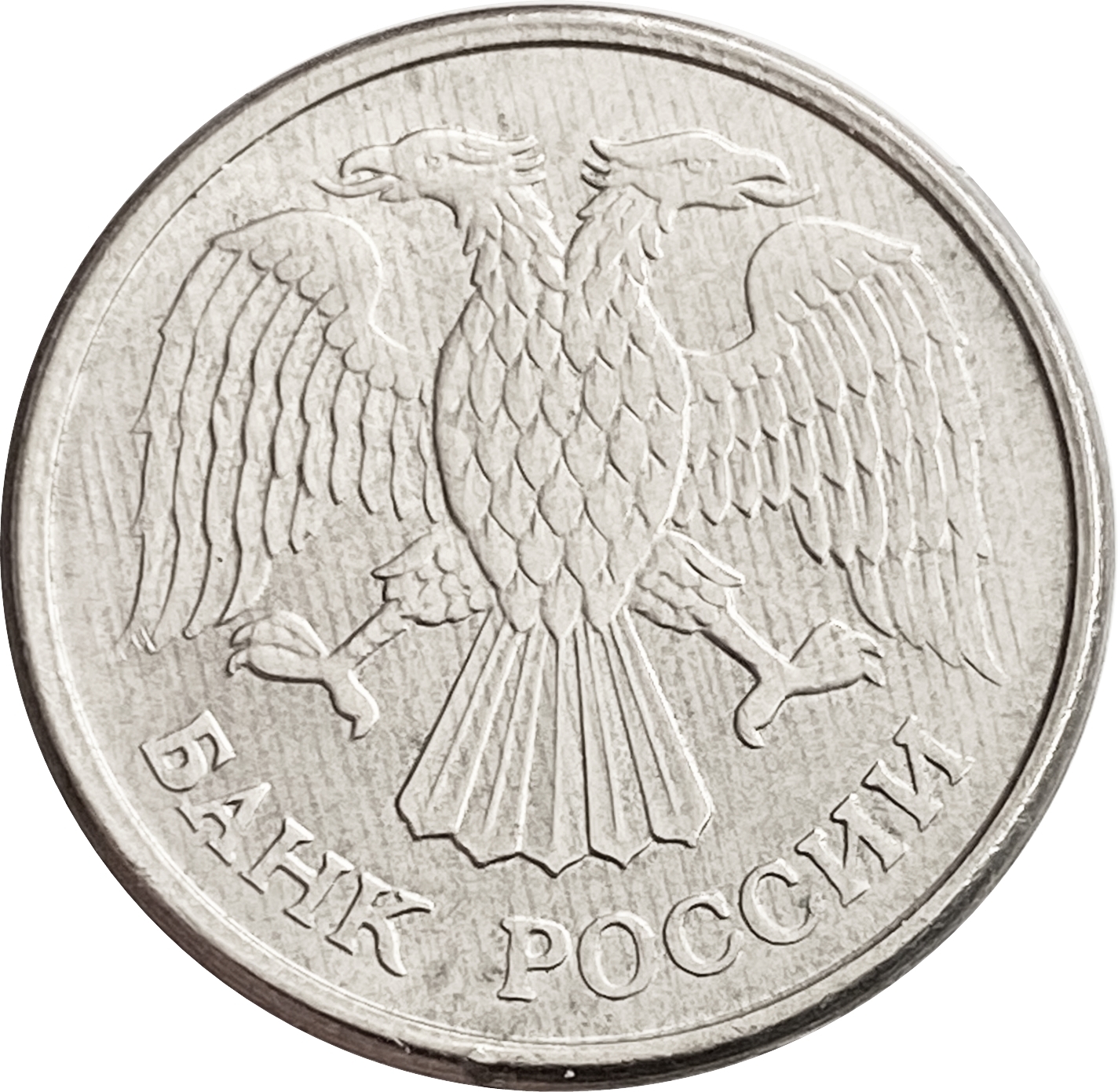 Аверс: по центру изображение двуглавого орла с опущенными крыльями. Снизу, вдоль края монеты надпись: "БАНК РОССИИ".