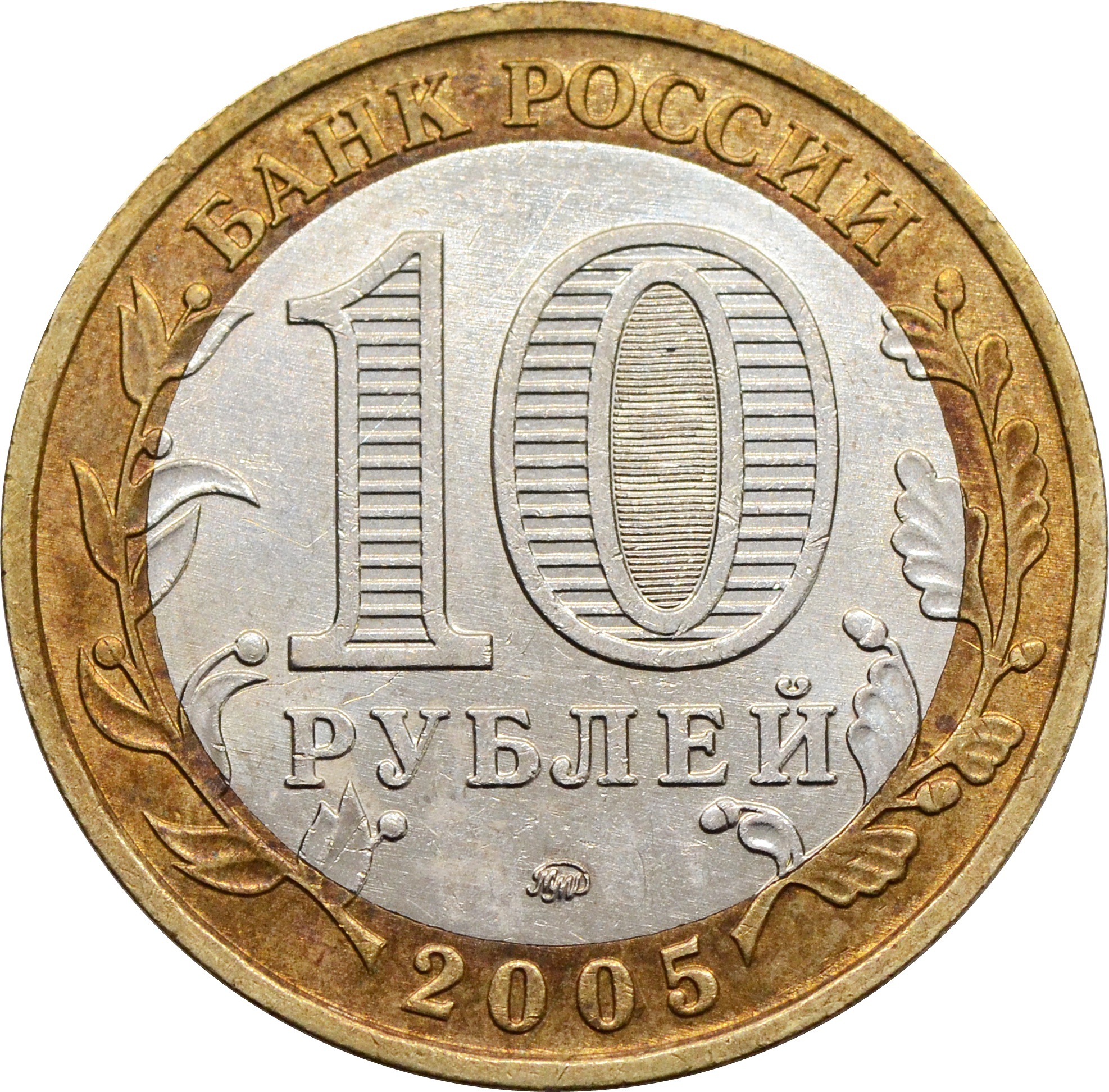 Аверс: в центре указан номинал монеты: "10 РУБЛЕЙ". Внутри цифры "0" - скрытые, видимые поочередно при изменении угла зрения изображения цифры: "10" и надписи: "РУБЛЕЙ". В нижней части знак монетного двора: "ММД". В верхней части кольца по окружности расположена надпись: "БАНК РОССИИ", в нижней указан год чеканки: "2005". Слева и справа изображены стилизованные ветви растений.