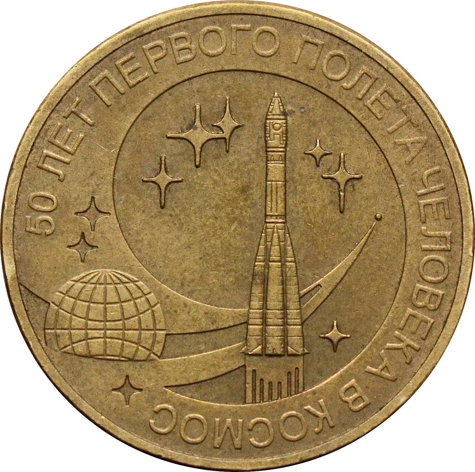 Реверс: в центре, на фоне звездного неба размещено изображение стартующей ракеты, а слева от нее планеты. Вдоль канта, по кругу, надпись: "50 ЛЕТ ПЕРВОГО ПОЛЕТА ЧЕЛОВЕКА В КОСМОС", расположенная на широкой полосе.
