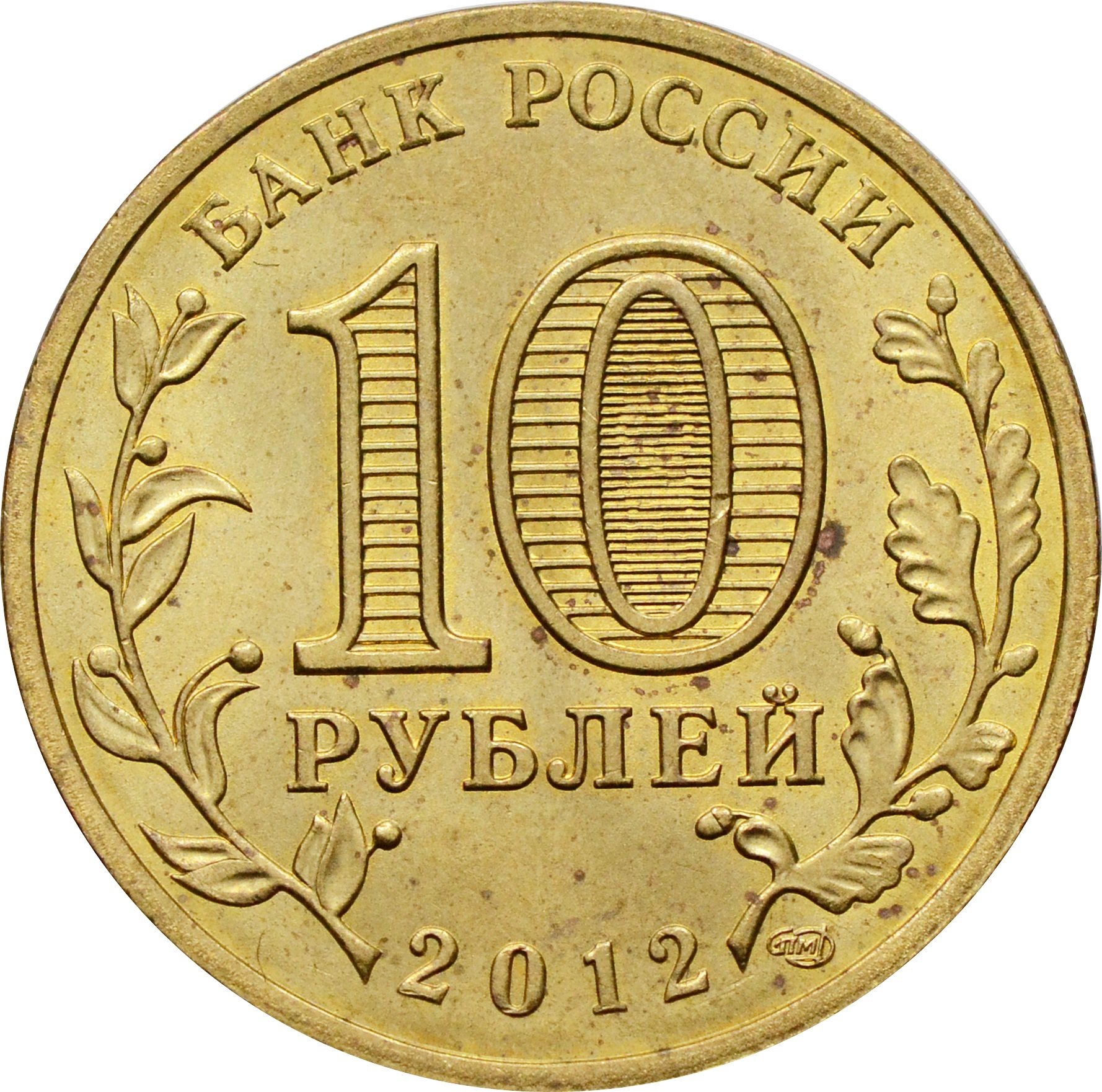 Аверс: по центру указан номинал монеты: "10 РУБЛЕЙ". Внутри цифры "0" - скрытые, видимые поочередно при изменении угла зрения изображения цифры "10" и надписи "РУБ". Вдоль канта расположена надпись: "БАНК РОССИИ". Снизу год чеканки: "2012". Слева находится изображение лавровой ветви, а справа дубовой.