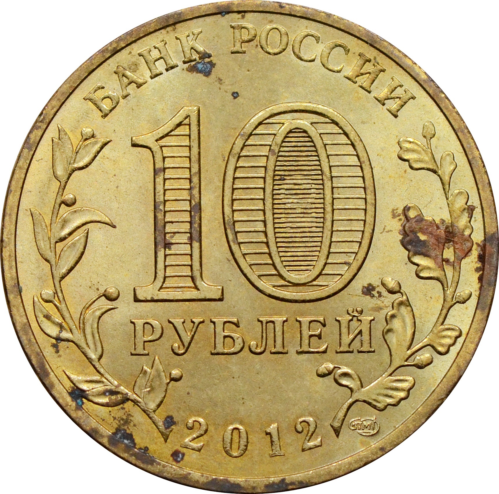 Аверс: по центру указан номинал монеты: "10 РУБЛЕЙ". Внутри цифры "0" - скрытые, видимые поочередно при изменении угла зрения изображения цифры "10" и надписи "РУБ". Вдоль канта расположена надпись: "БАНК РОССИИ". Снизу год чеканки: "2012". Слева находится изображение лавровой ветви, а справа дубовой.