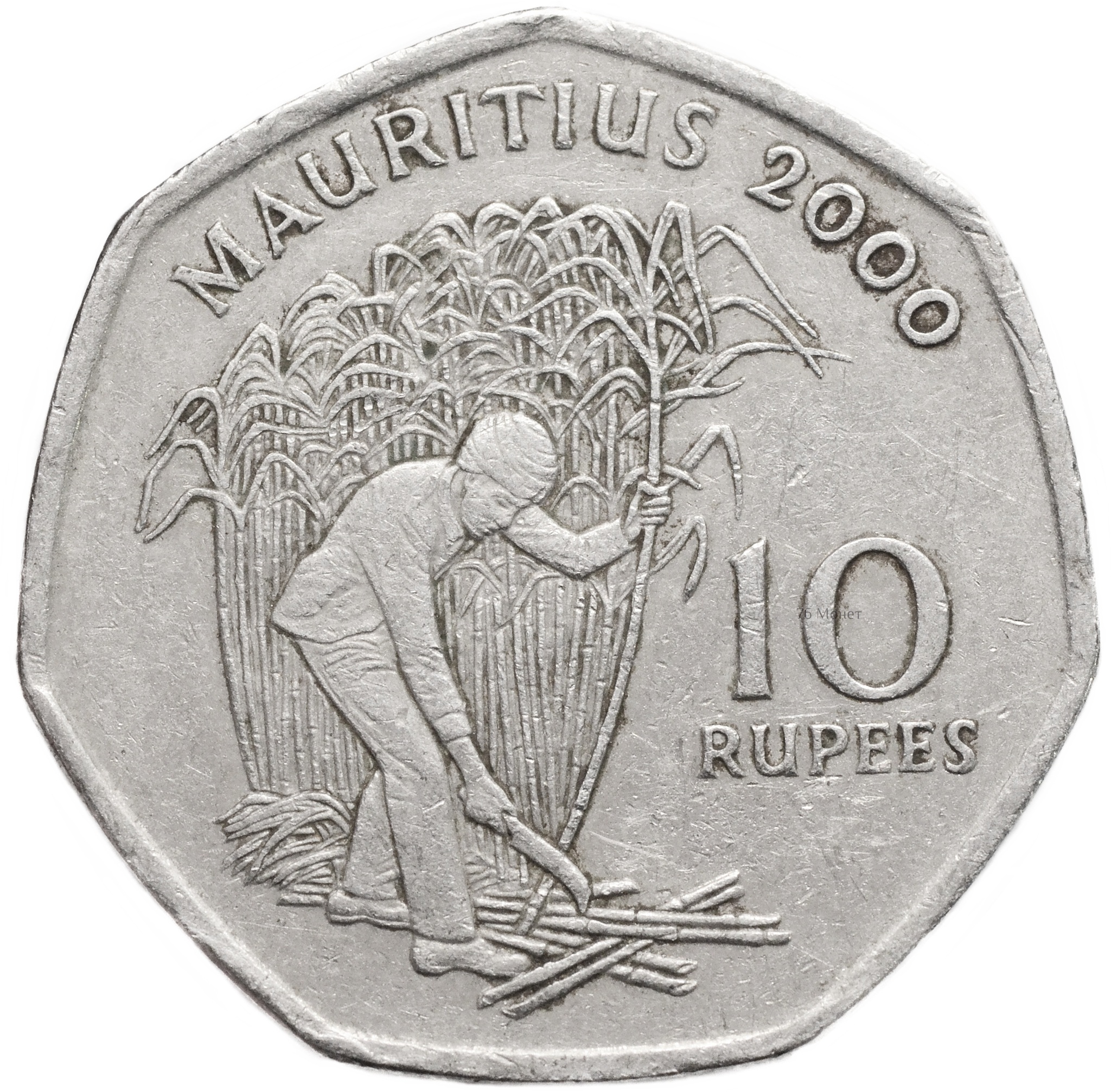 Реверс: по центру монеты изображен работающий человек. Сверху надпись: "MAURITIUS" и год чеканки: "2000". Снизу прописан номинал: "10 RUPEES".