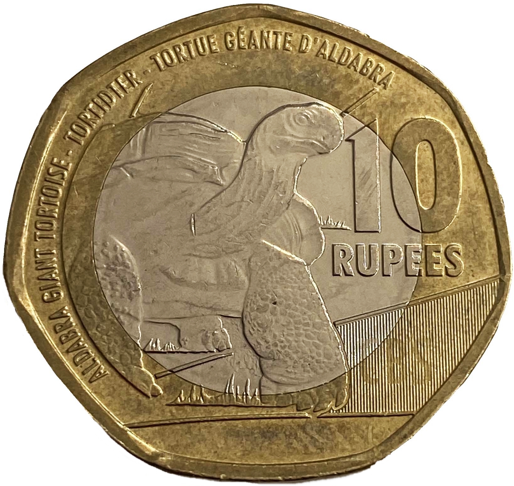 Реверс: в центре монеты изображена Альдабрская гигантская черепаха, правее от которой указан номинал "10 RUPEES". По левому краю, вдоль канта, расположена надпись: "Aldabra Giant Tortoise - Tortidter - Tortue Géante d'Aldabra".