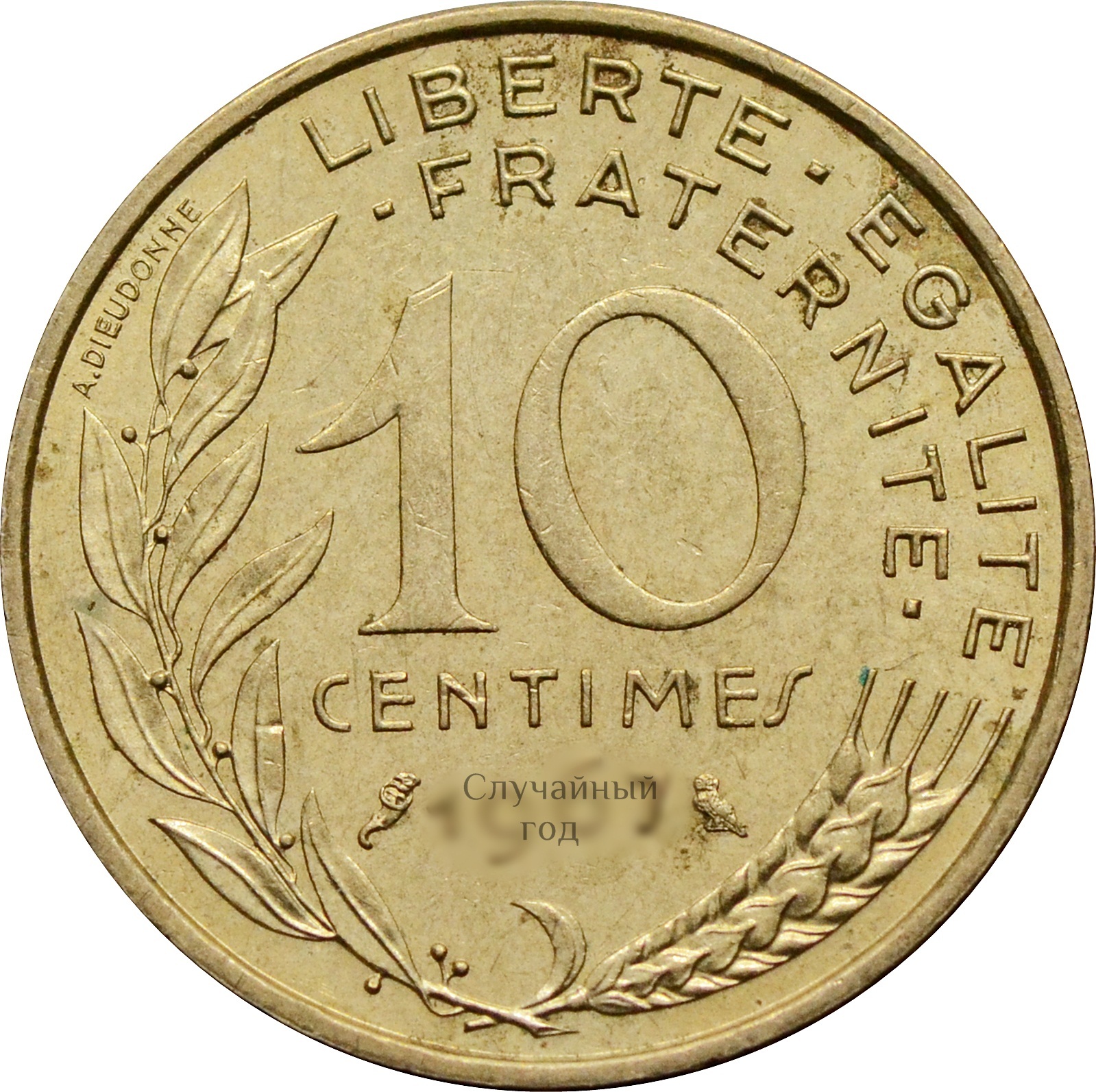 Монета 10 сантимов 1962-2001 (случайный год) Франция в состоянии XF (отличное).