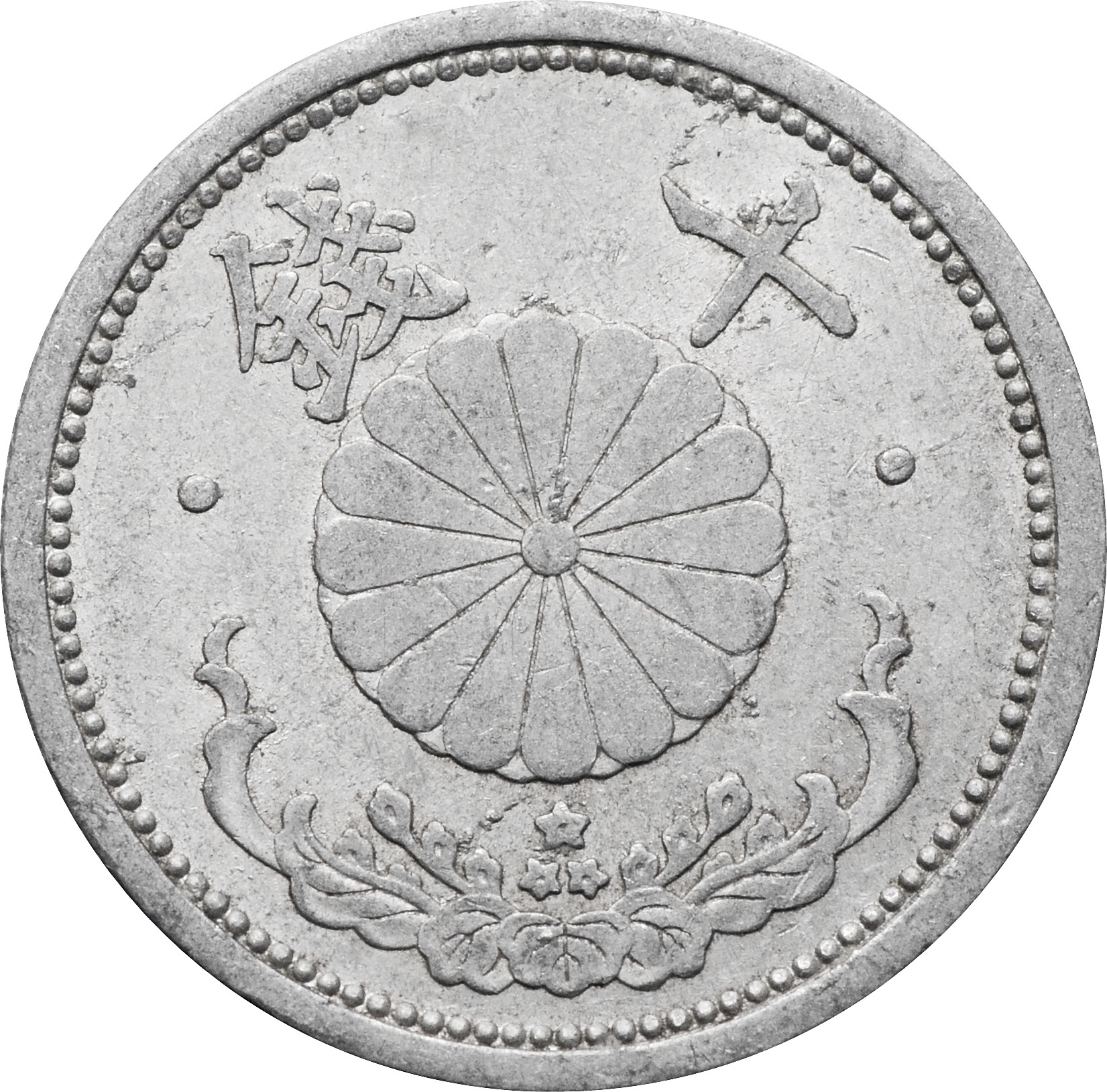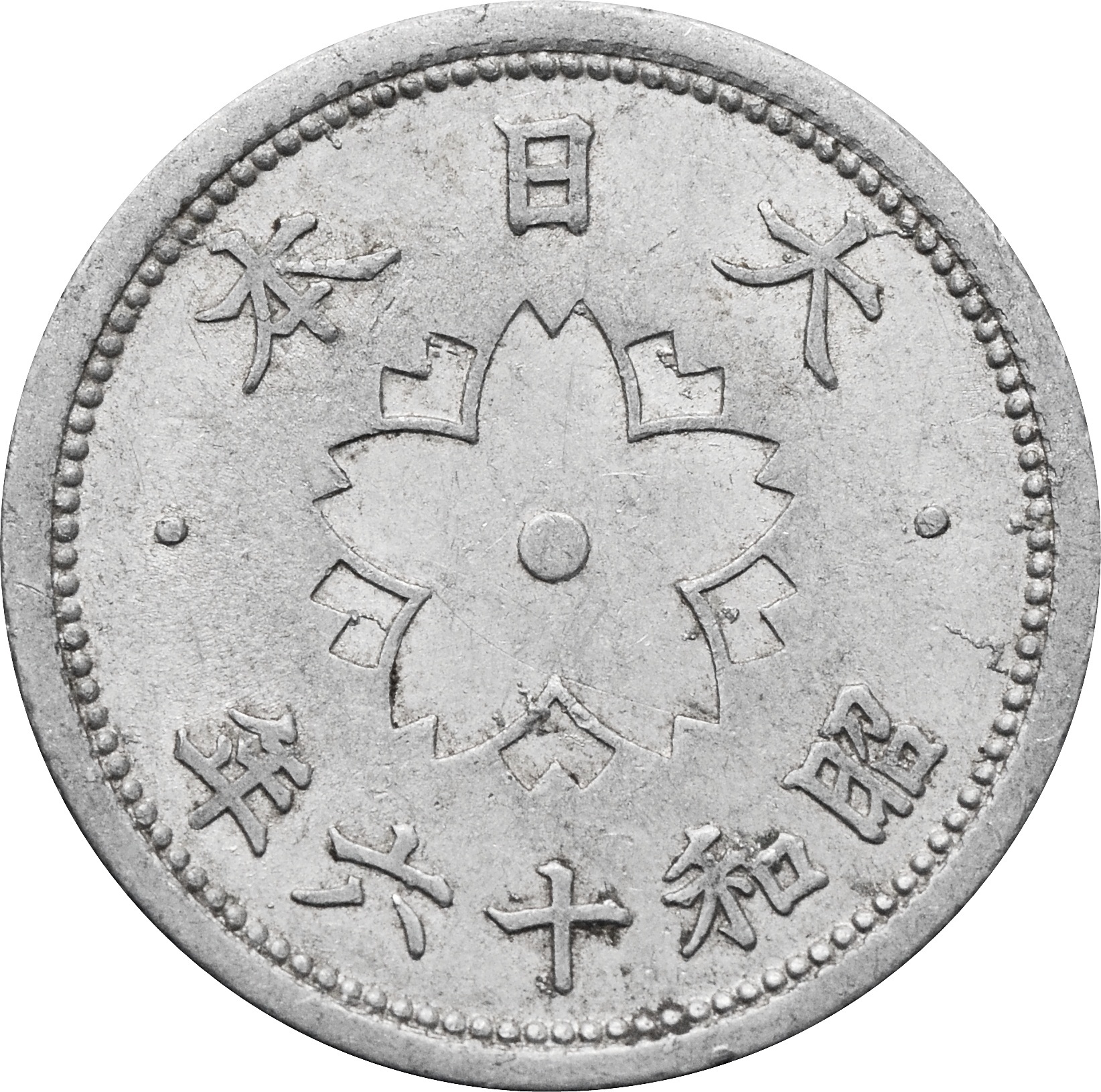 Аверс: по центру монеты изображен цветок. Сверху надпись: "本日大", а снизу прописан год чеканки: "年六十和昭".