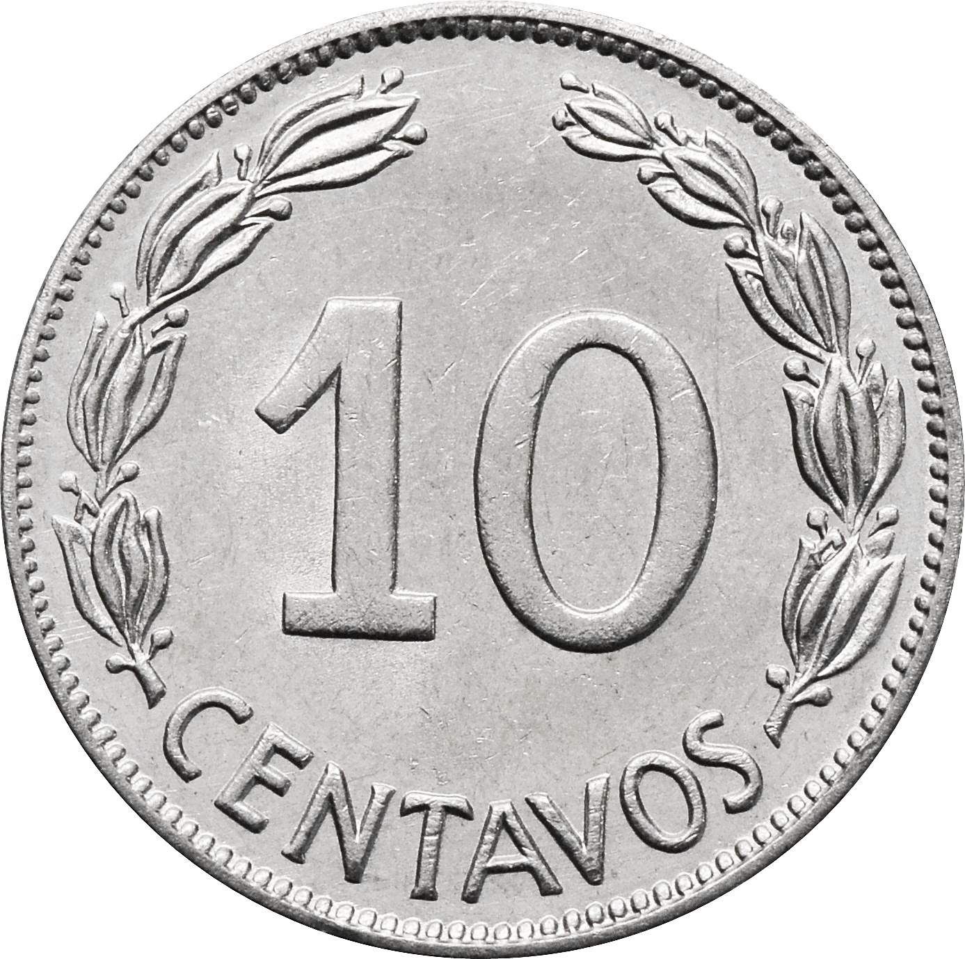 Реверс: по центру монеты указан номинал: "10 CENTAVOS".