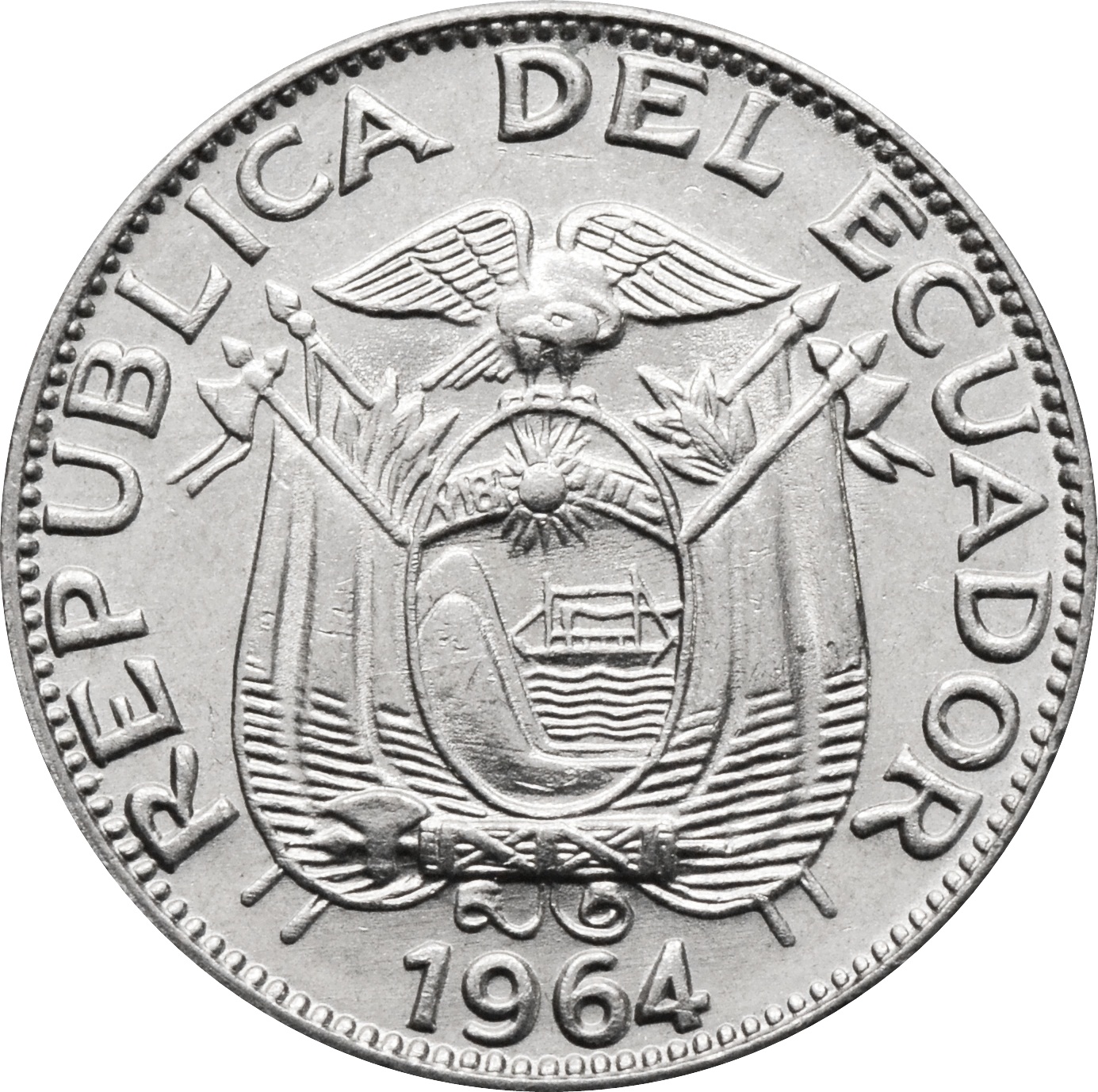 Аверс: в центре монеты герб страны. В самом низу размещен год чеканки: "1964". Вдоль канта надпись: "REPUBLICA DEL ECUADOR".