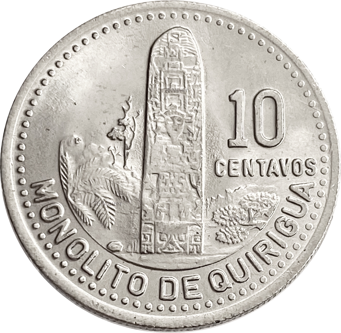 Реверс: по центру изображен Монолит Киригуа. Справа указан номинал в две строки: "10 CENTAVOS".