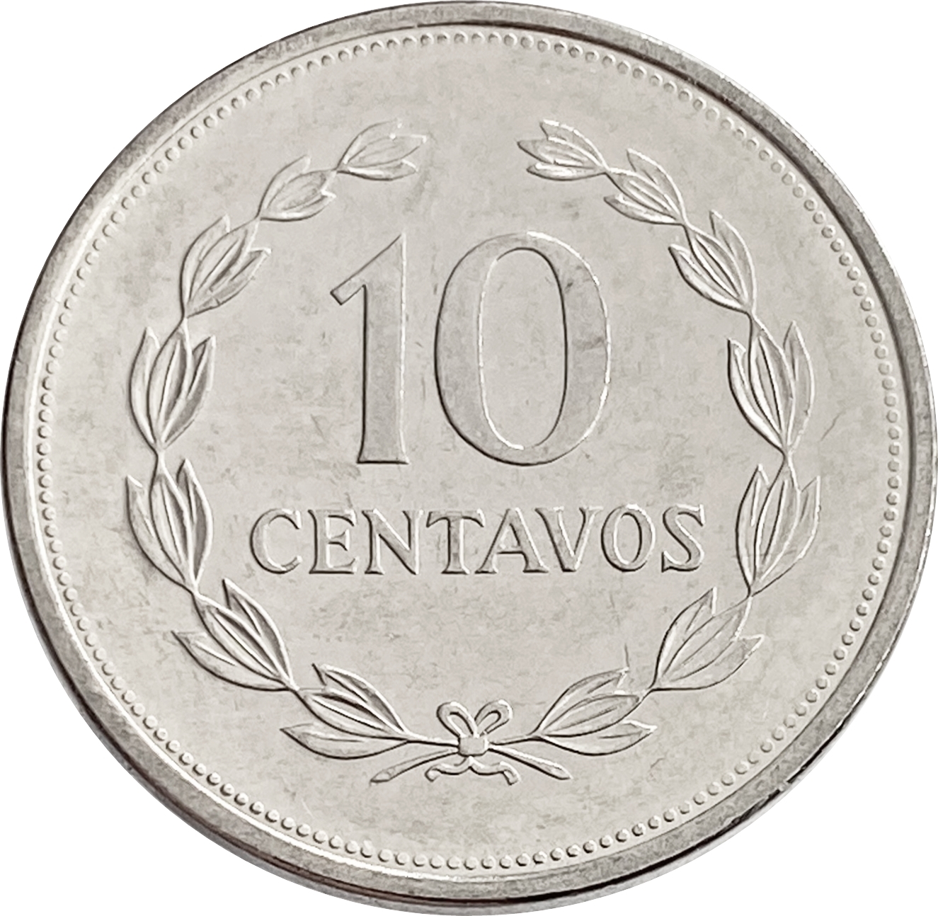 Реверс: в центре монеты указан номинал монеты в обрамлении венков: "10 CENTAVOS".
