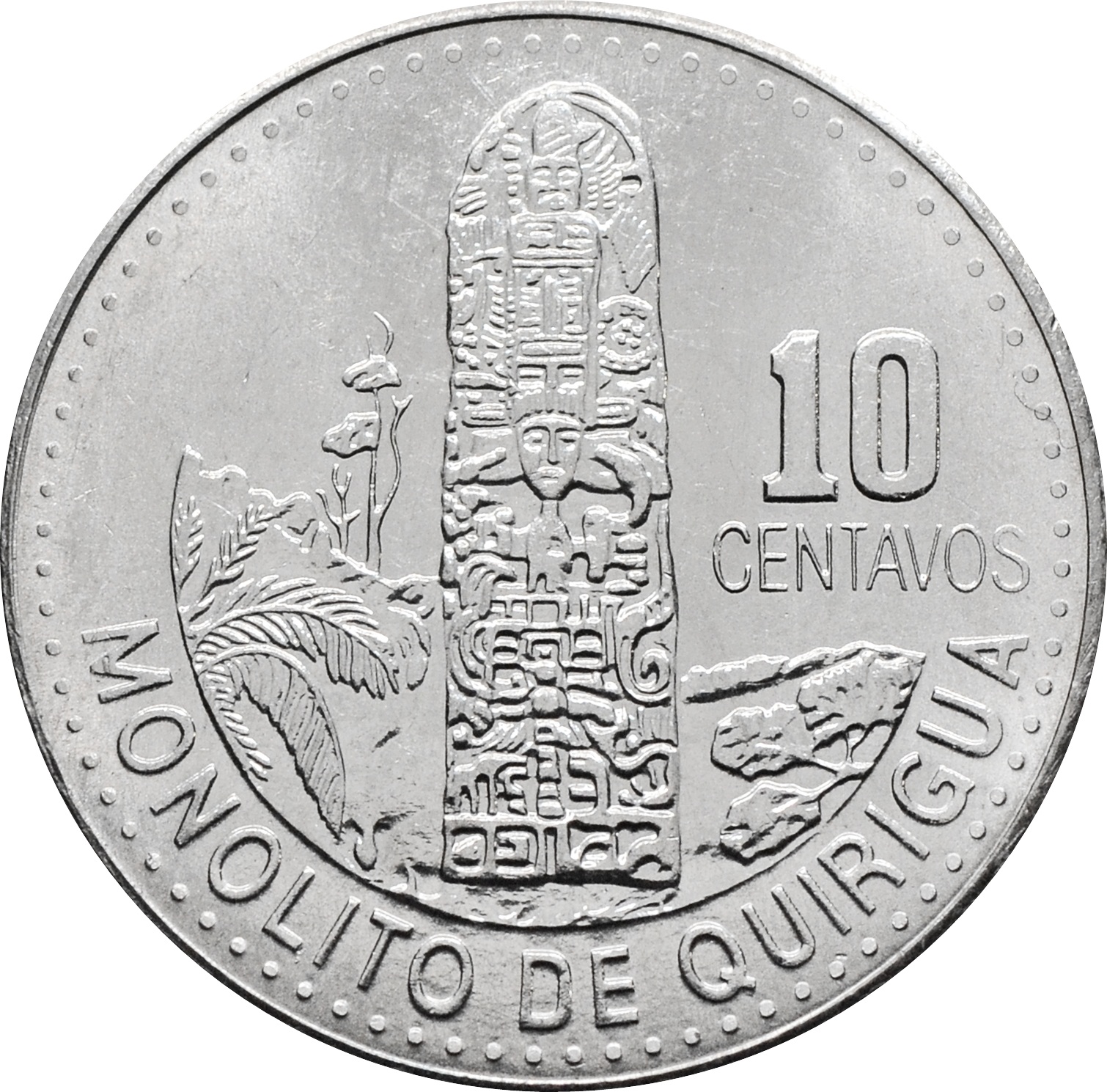 Реверс: по центру изображен Монолит Киригуа. Справа указан номинал в две строки: "10 CENTAVOS".