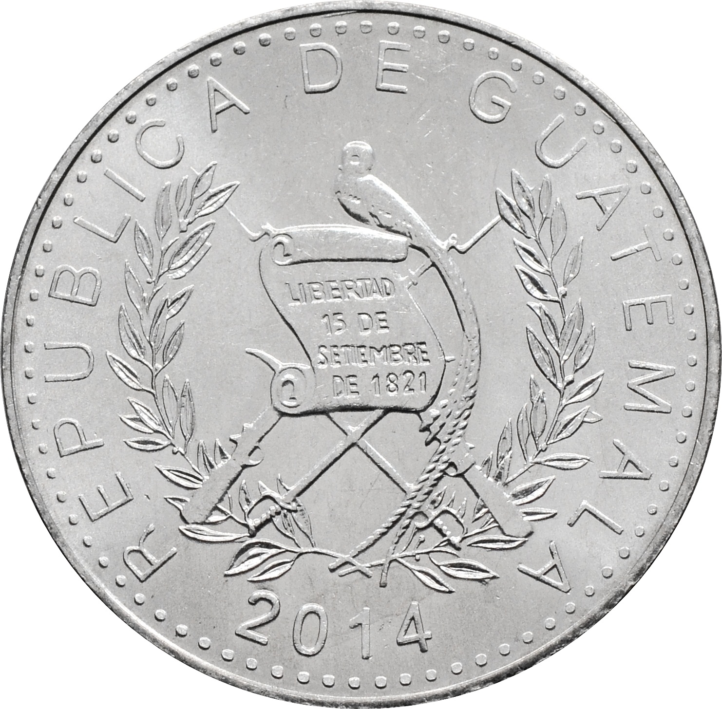 Аверс: в центре государственный герб Гватемалы, надпись по канту: "REPUBLICA DE GUATEMALA". Внизу расположен год чеканки монеты: "2014".
