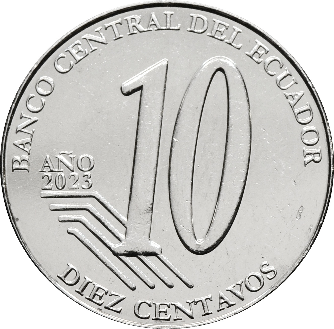 Реверс: по центру монеты указан номинал большой цифрой - "10". Вдоль нижнего края монеты надпись: "DIEZ CENTAVOS", слева надпись поверх стилизованного флага: "AÑO 2023". Вверху расположен текст: "BANCO CENTRAL DEL ECUADOR".