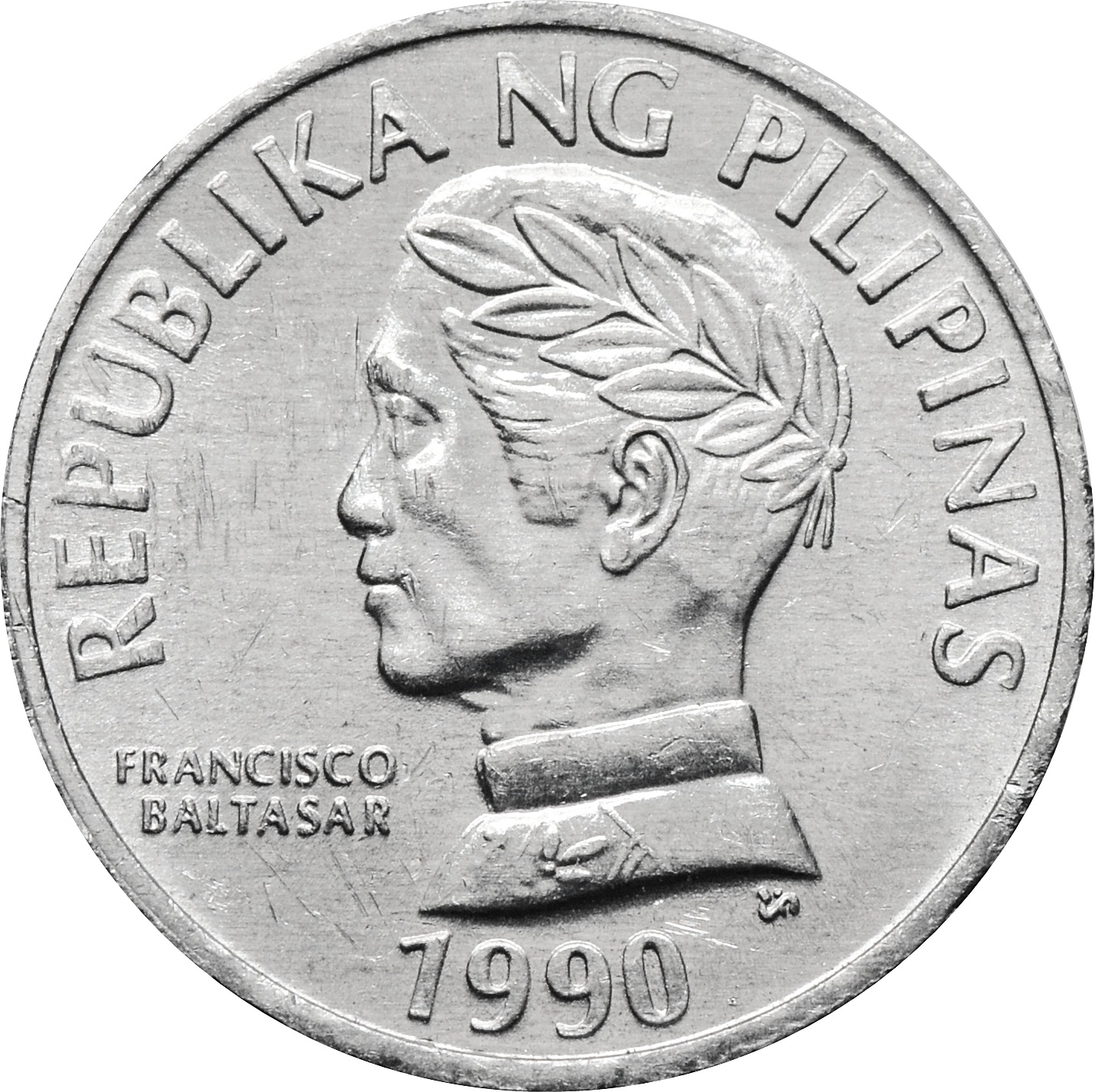 Аверс: в центре монеты размещен портрет Филиппинского тагалоязычного поэта, классика и основоположника тагальского литературного языка. Сверху по краю монеты круговая надпись: "REPUBLIKA NG PILIPINAS", а под ним год чеканки: "1990".