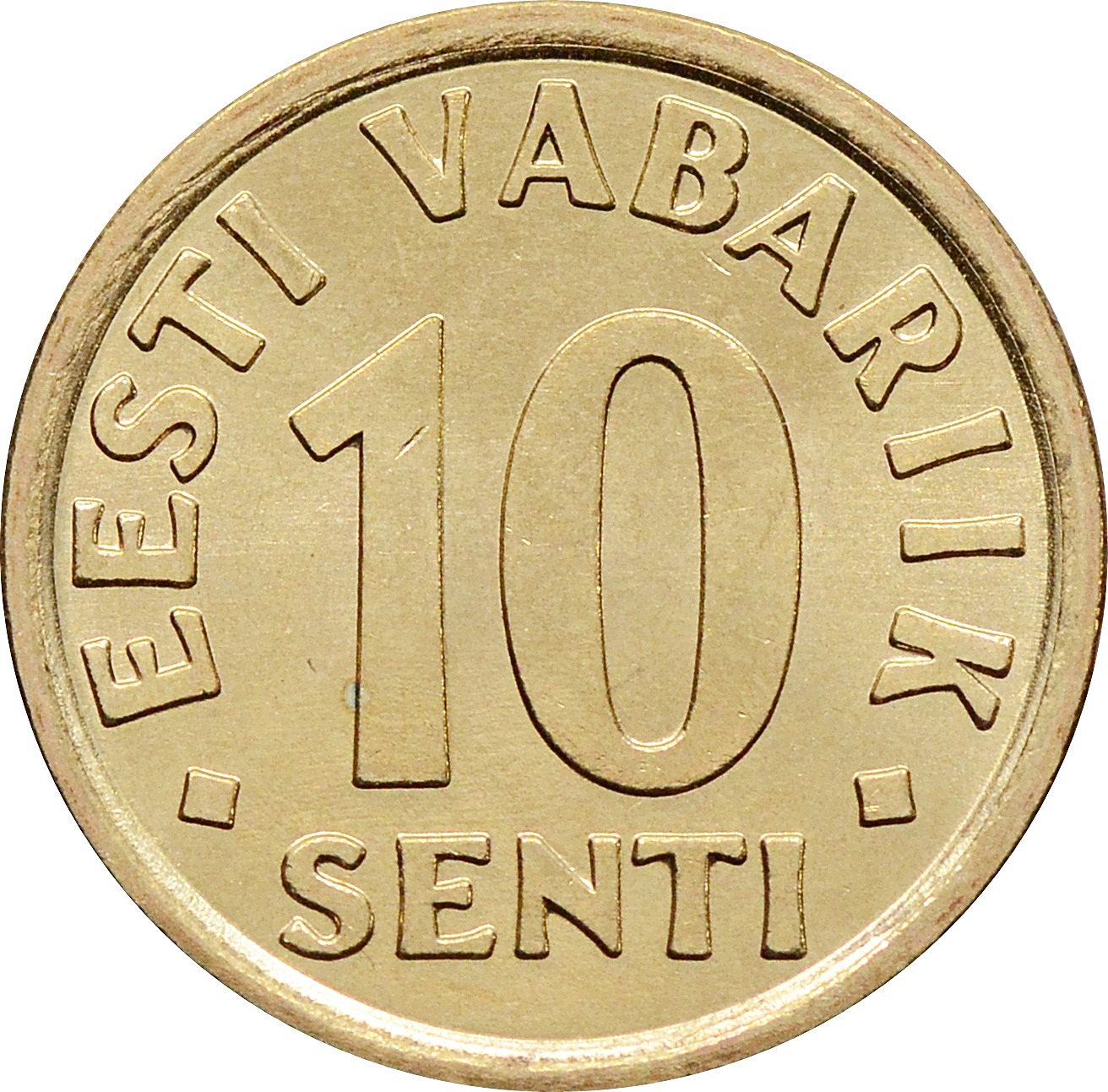 Реверс: в центре монеты указан номинал в две строки: "10 SENTI". Сверху, полукругом, надпись: "EESTI VABARIIK".