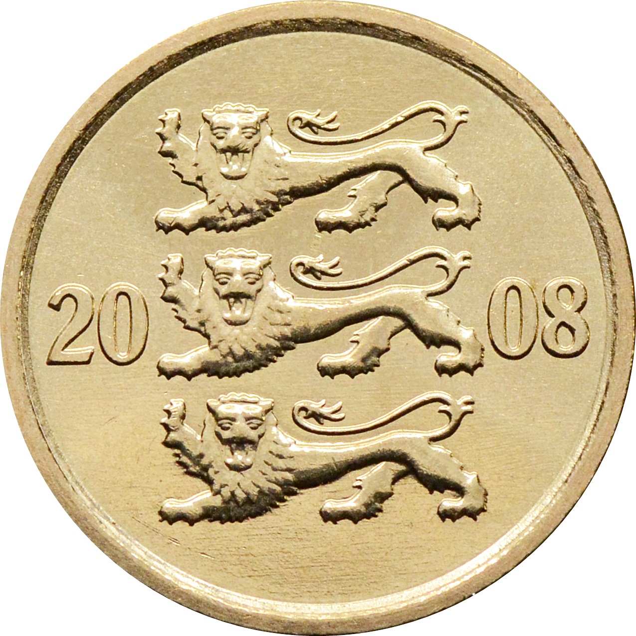Аверс: по центру расположился герб Эстонии, который разделяет год чеканки монеты на две части: "2008 ".