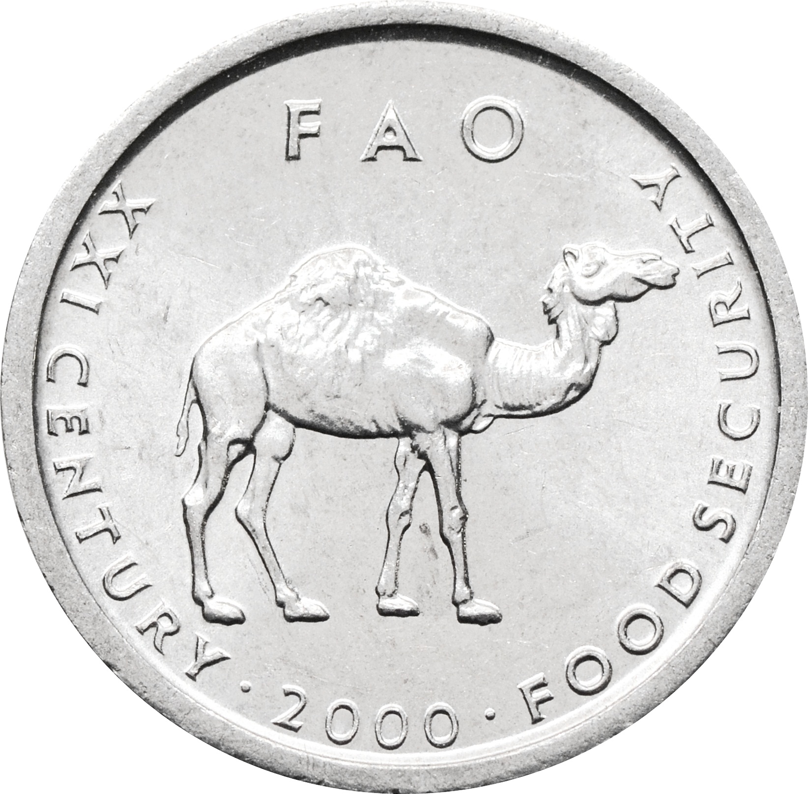Реверс по центру монеты изображение верблюда. Снизу, по канту, надпись: "XXI CENTURY 2000 FOOD SECURITY". Сверху надпись: "FAO".