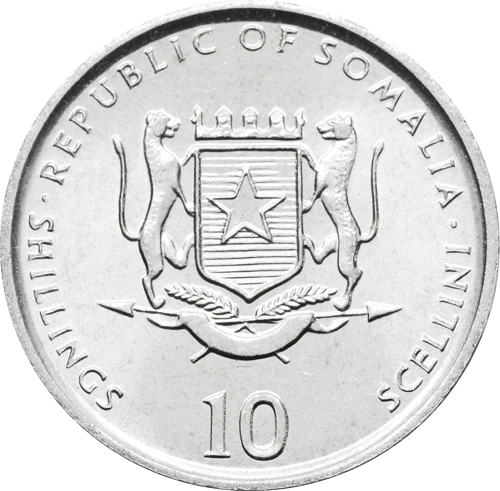 Аверс в центре расположен герб страны. По краю монеты надписи полукругом: "SHILLINGS REPUBLIC OF SOMALIA SCELLINI". Внизу указана цифра номинала - "10".