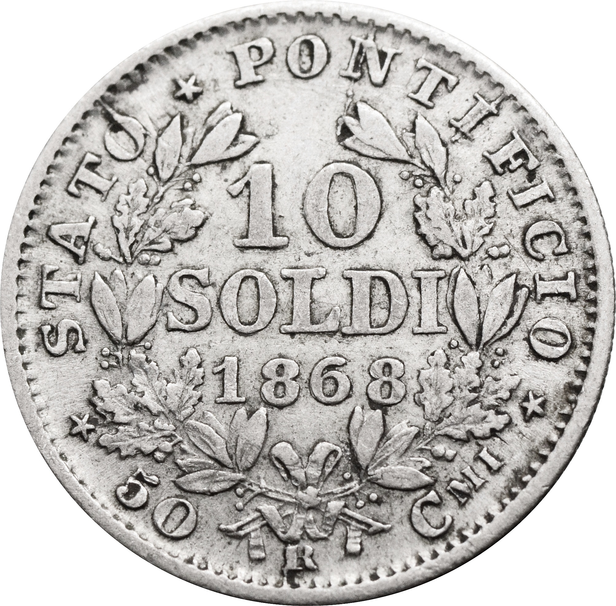 Реверс: по центру указан номинал: "10 SOLDI". Ниже год: "1868". Сверху подпись: "STATO PONTIFICIO".