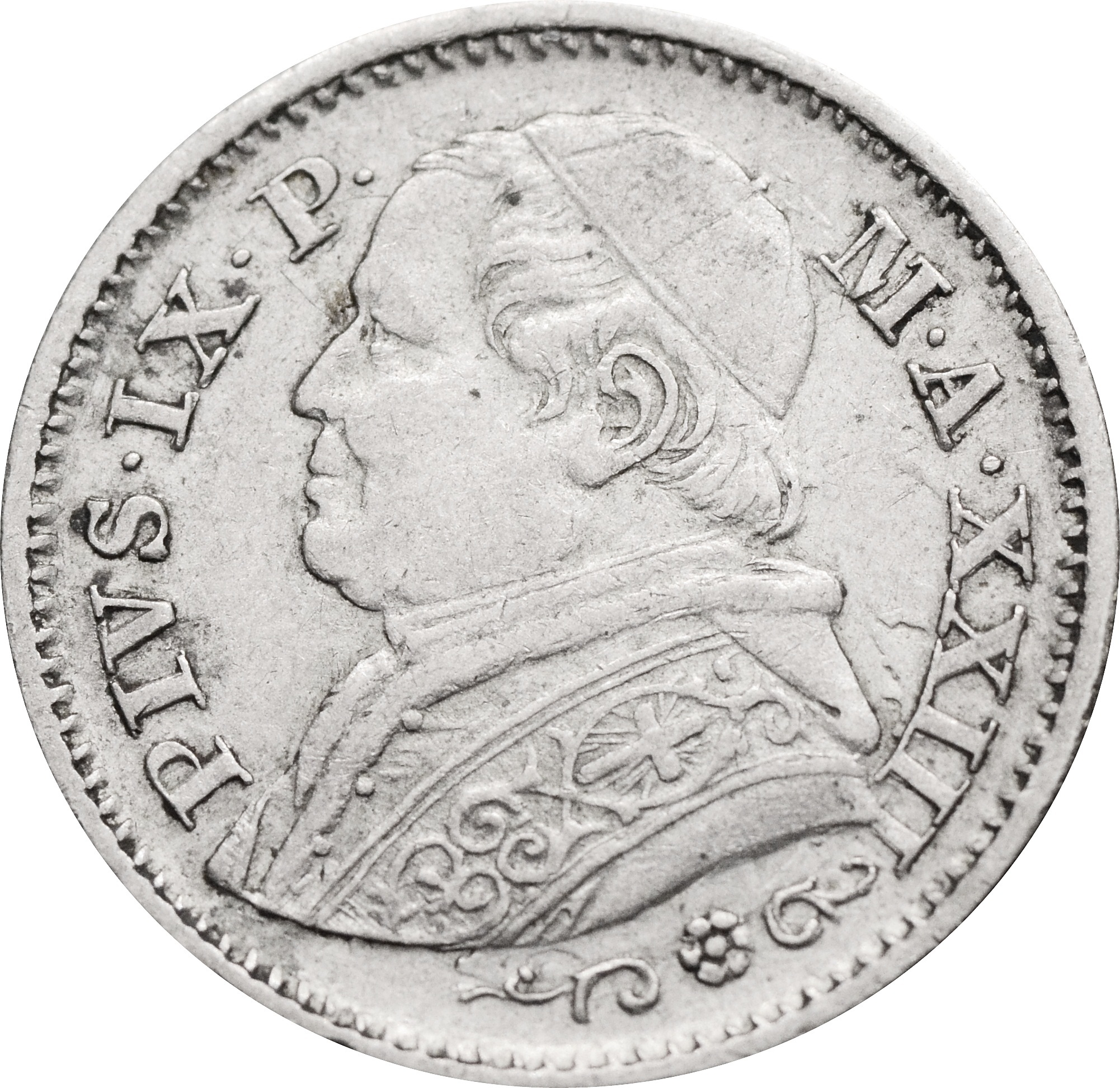 Аверс: в центре изображен Папа Пий IX влево. Рядом расположены надписи: "PIVS IX P M A".