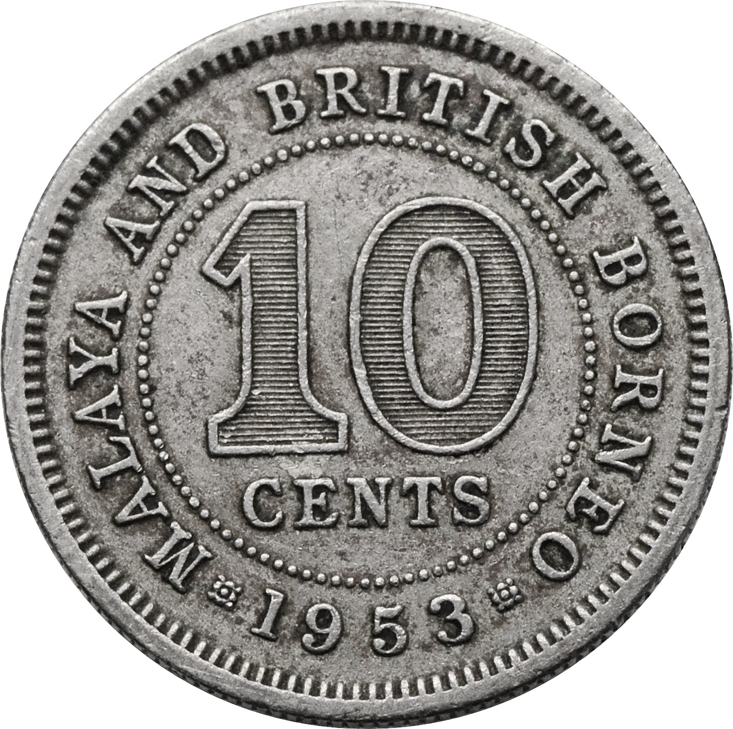 Реверс: в центре номинал монеты: "10 CENTS", надпись по кругу в кольцевом орнаменте: "MALAYA AND BRITISH BORNEO". Снизу указан год чеканки: "1953".