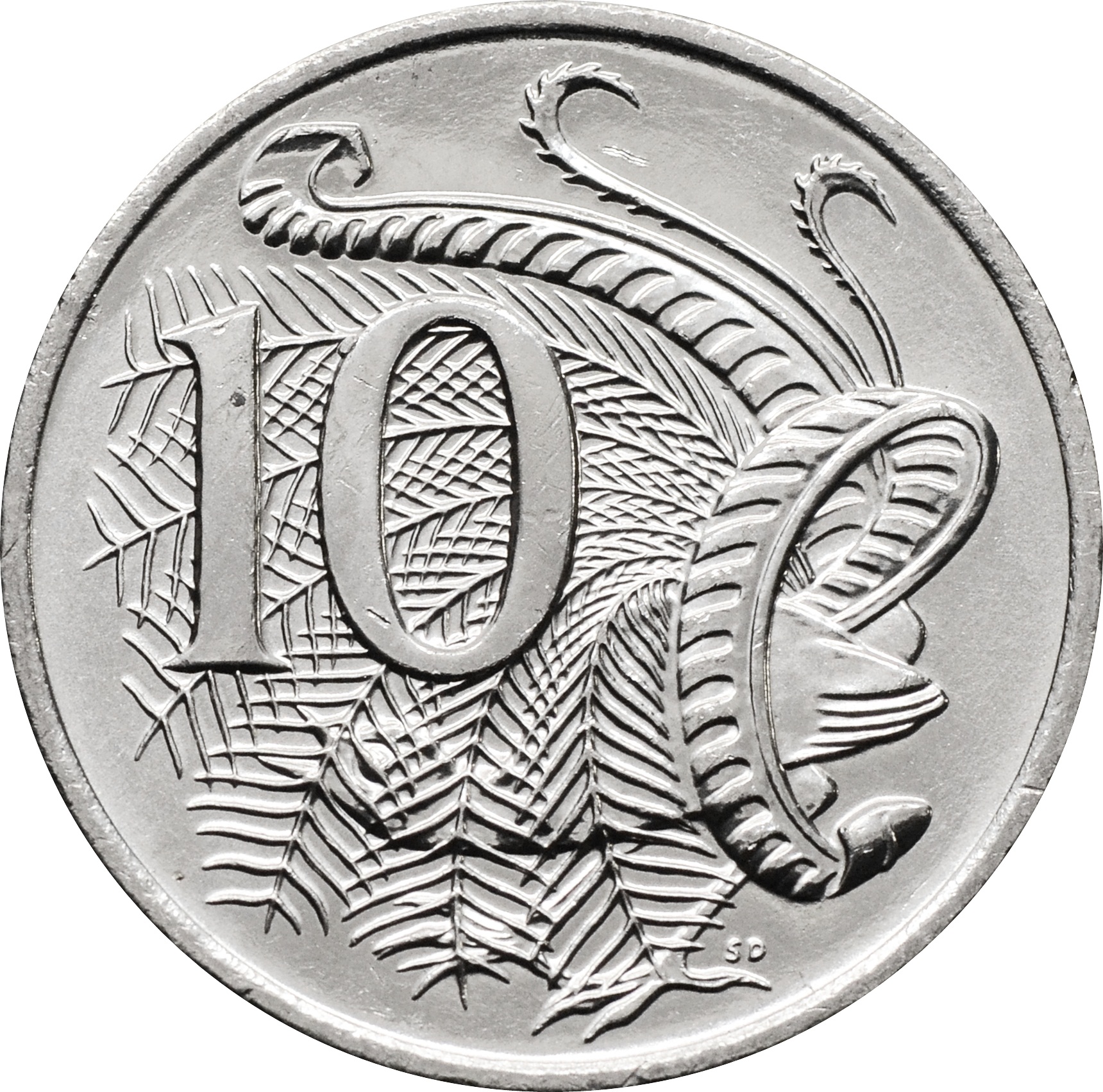Реверс: по центру изображен большой лирохвост и указан номинал монеты: "10".