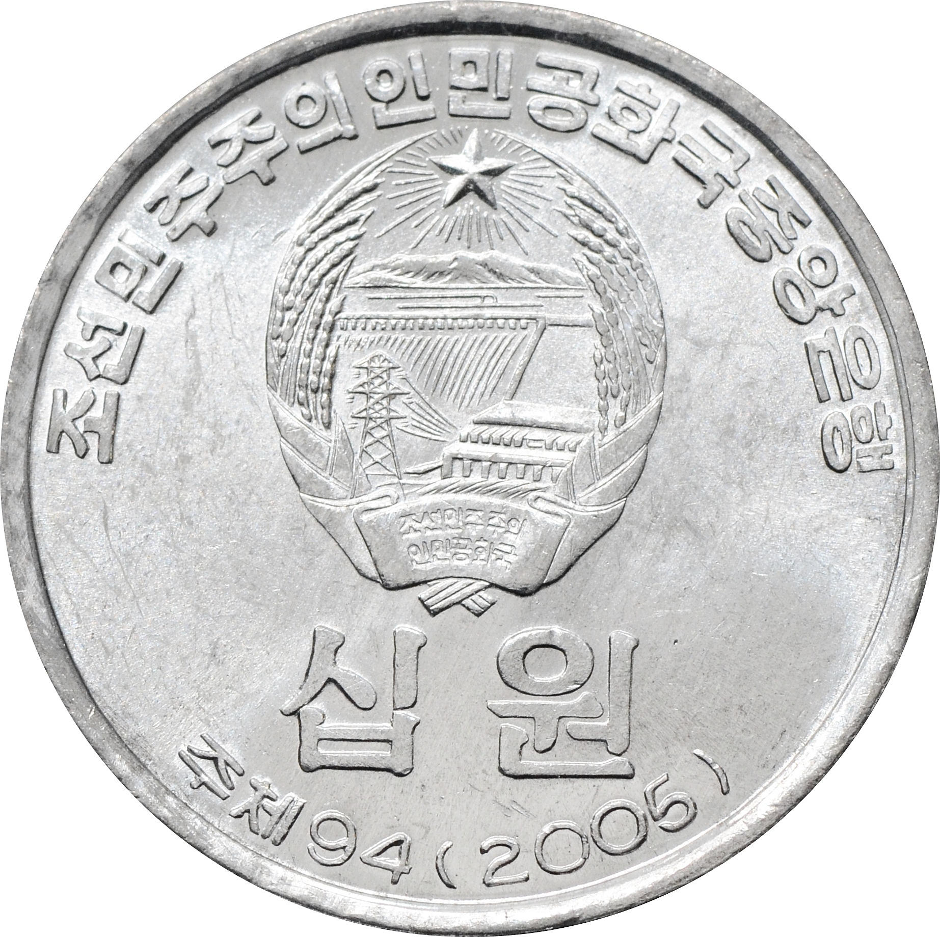 Аверс: по центру размещен герб Северной Кореи. Под ним надпись: "오원" и год чеканки: "주체94 (2005)". Сверху надпись: "조선민주주의인민공화국중앙은행".