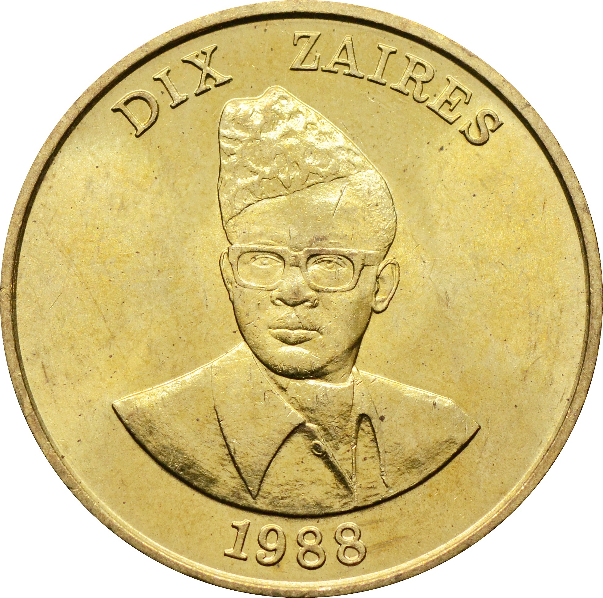 Аверс: в центре изображён президент Мобуту. Снизу год чеканки монеты: "1988", а сверху подпись: "DIX ZAIRES".