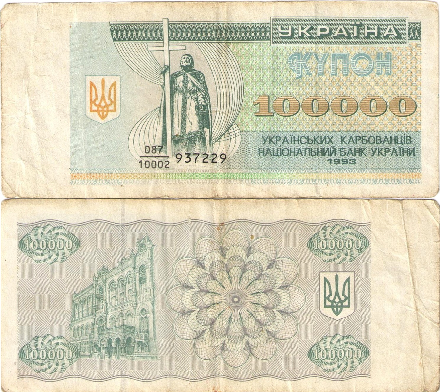 Банкнота 100 000 карбованцев 1993 Украина в состоянии G-VG