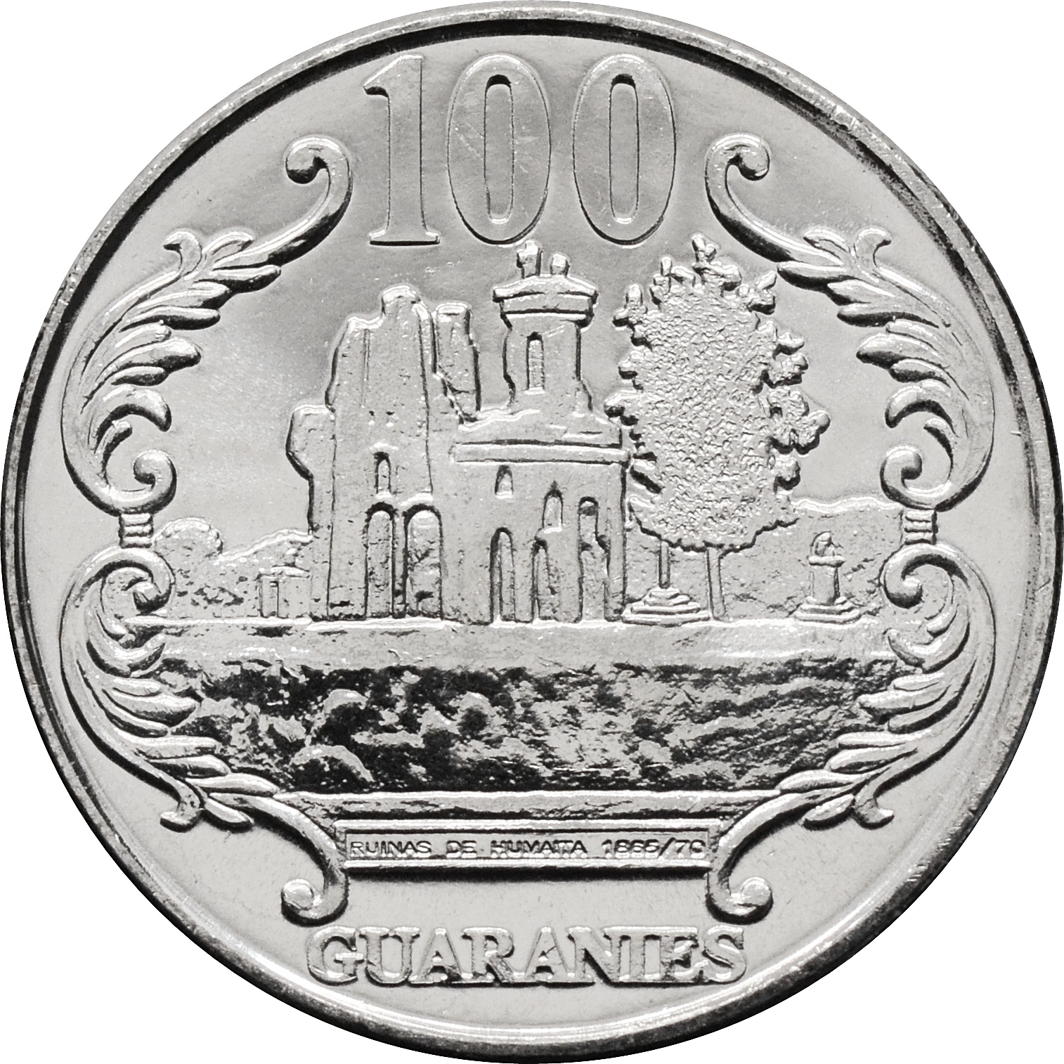 Реверс: прямо по центру изображены Руины Гумаита в обрамлении орнамента. В верхней части монеты – число "100", а в нижней надпись: "GUARANIES".