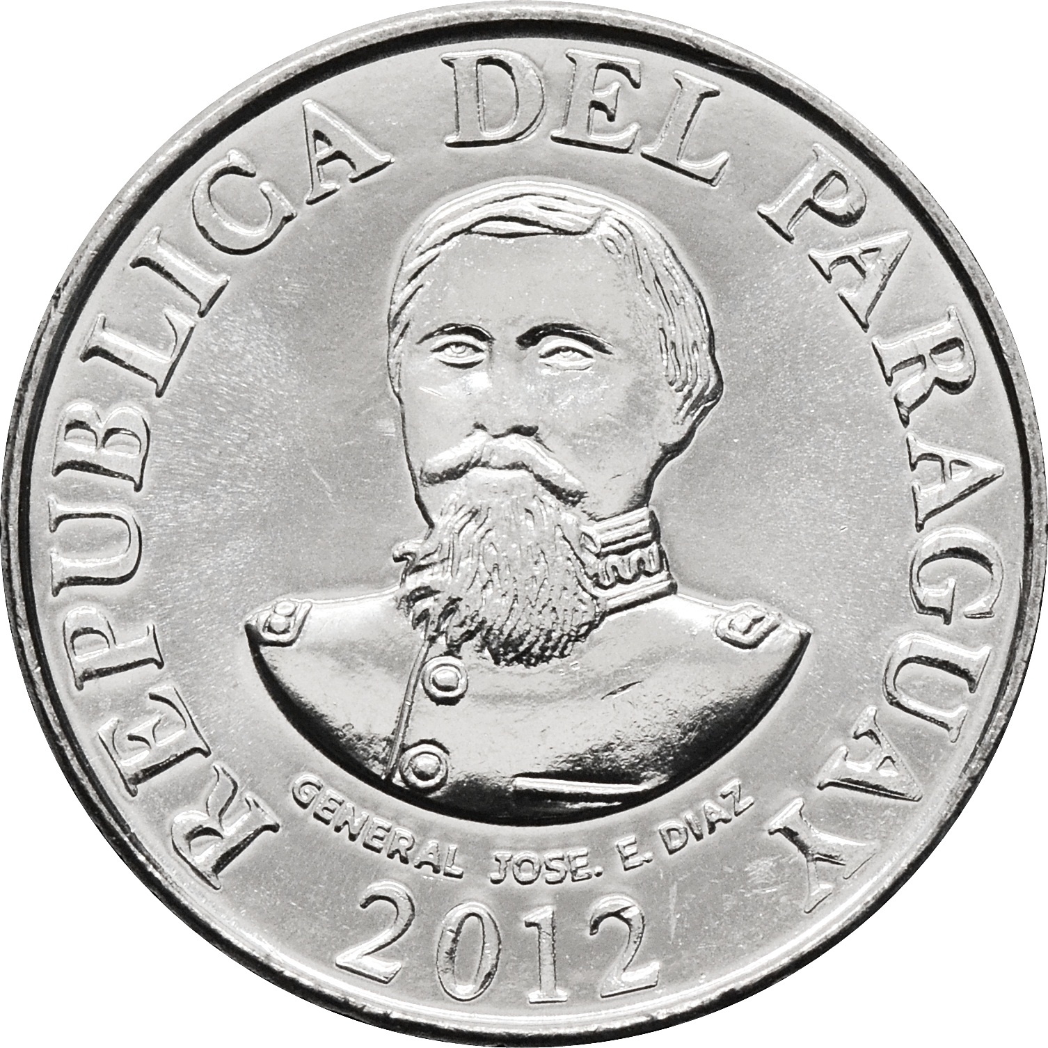 Аверс: в центре расположен портрет Хосе Эдувихис Диас - Парагвайского генерала. Ниже подпись: "GENERAL JOSE.E.DIAZ" и год чеканки: "2012". Сверху надпись: "REPUBLICA DEL PARAGUAY".