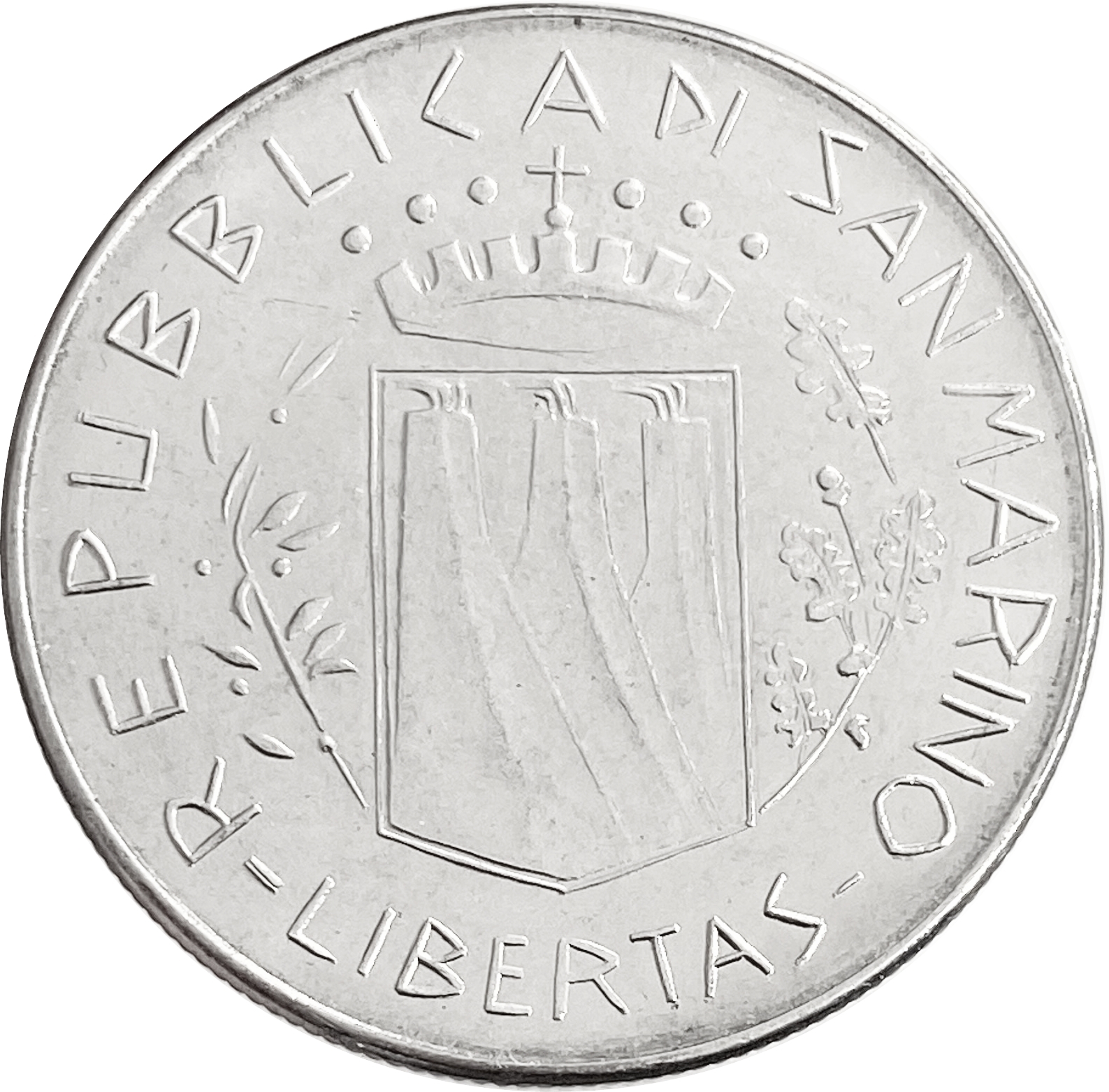 Аверс: в центре монеты находится увенчанный короной щит. Вдоль канта по кругу надпись: "LIBERTAS * REPUBBLICA DI SAN MARINO".