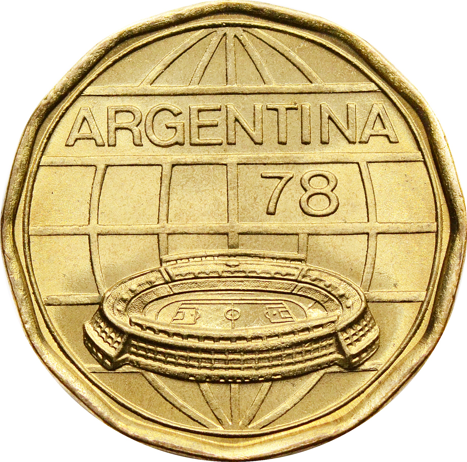 Аверс: в центре монеты изображена футбольная арена. Над ней надпись: "ARGENTINA 78".
