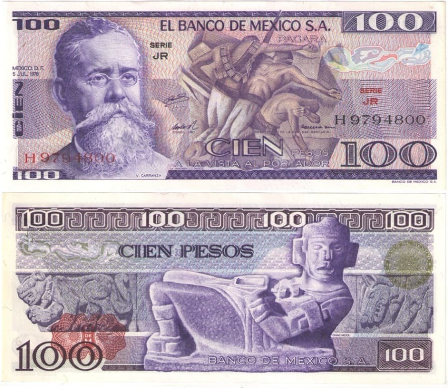 Оборотная сторона: по центру изображен Чак-Мооль из Тулы (название доколумбовых мезоамериканских каменных статуй). В каждом углу банкноты указана цифра номинала: "100". Левее от Чак-Мооль указан номинал прописью: "CIEN PESOS".
