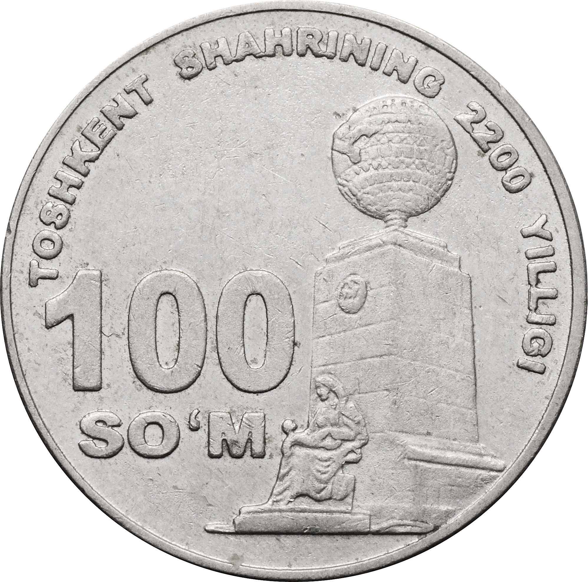 Реверс: чуть ниже центра изображена монумент Мустакиллик ва эзгуликв г. Ташкент, левее указан номинал в две строки: "100 SOʻM". Сверху надпись: "TOSHKENT SHAHRINING 2200 YILLIGI".