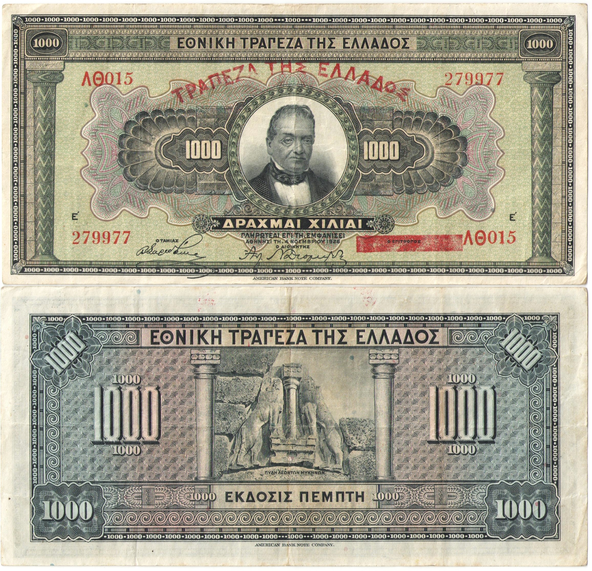 Лицевая сторона: по центру изображение Георгиоса Ставроса из издания "Magazin Ethnikon Imerologion Bretou" Мариноса Бретоса. Вверху справа и слева указан номинал цифрой. Сверху новое имя банка Греции.