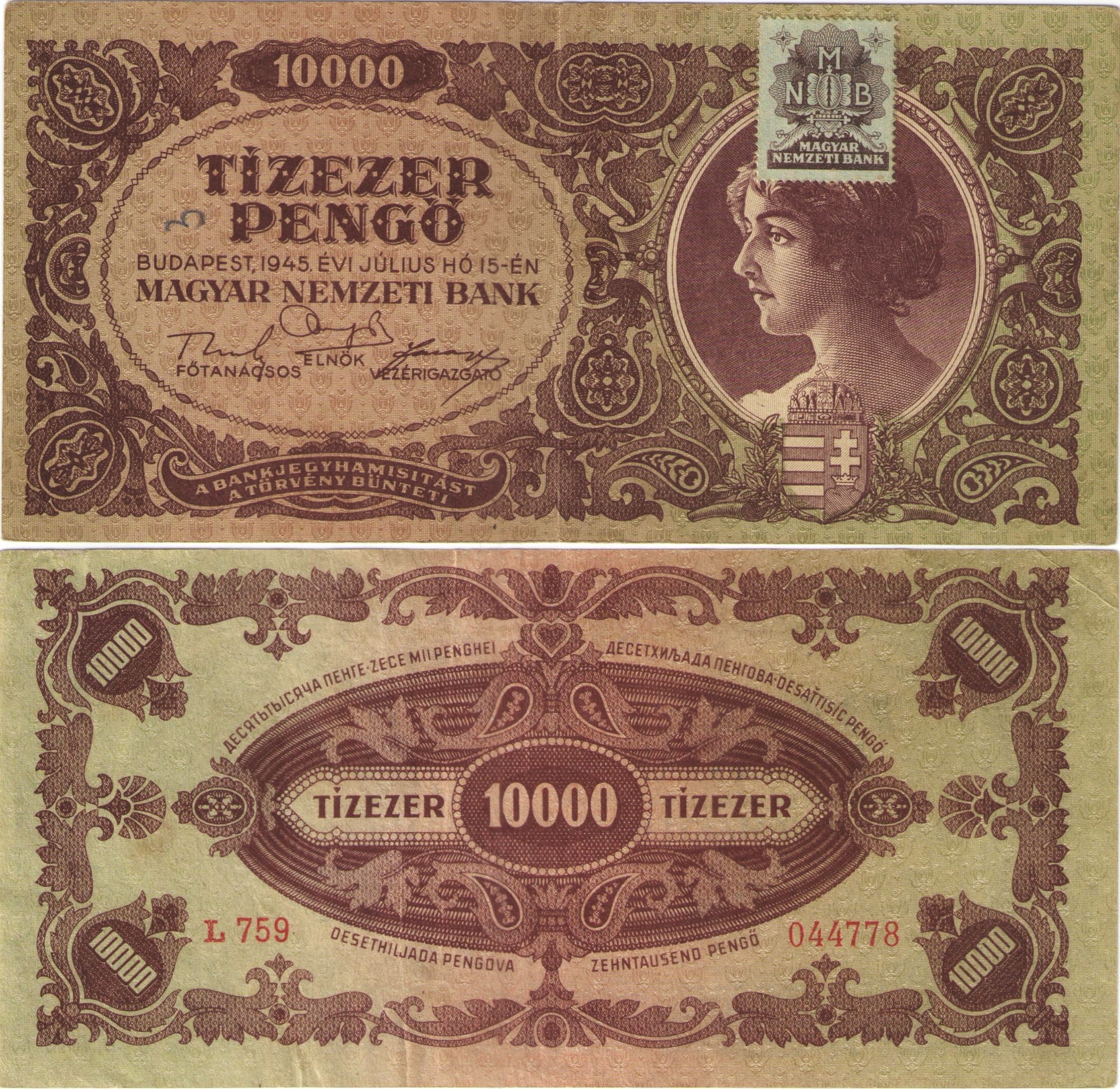 Лицевая сторона: в правой части расположен портрет женщины в овальной рамке. В левой части указание номинала цифрой - "10000" и прописью: "TIZEZER PENGO", чуть ниже надпись: "BUDAPEST, 1945 EVI JULIUS HO l15-EN MAGYAR NEMZETI BANK" и подписи управляющих.