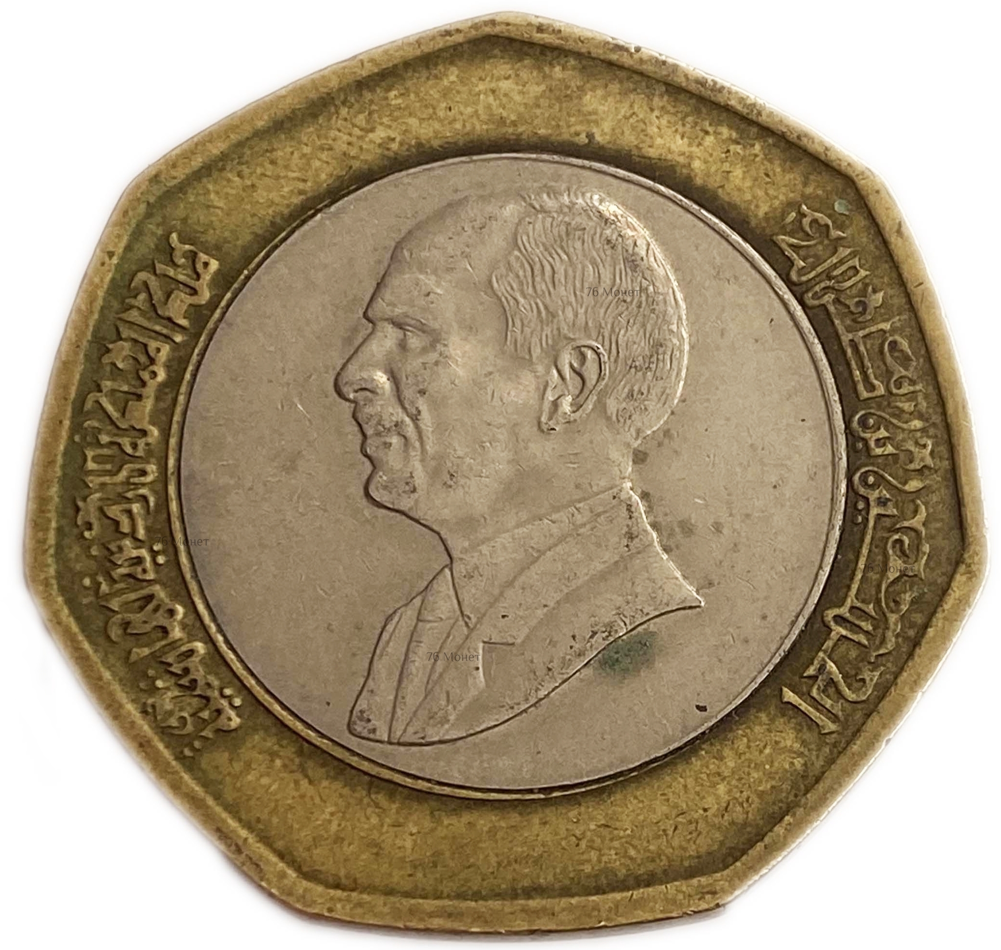 Аверс: в центре монеты изображение короля Аль Хусейна бен Талала влево. Вдоль края монеты надпись: слева -"ملك المملكة الأردنية الهاشمية", а справа - "الحسين بن طلال".