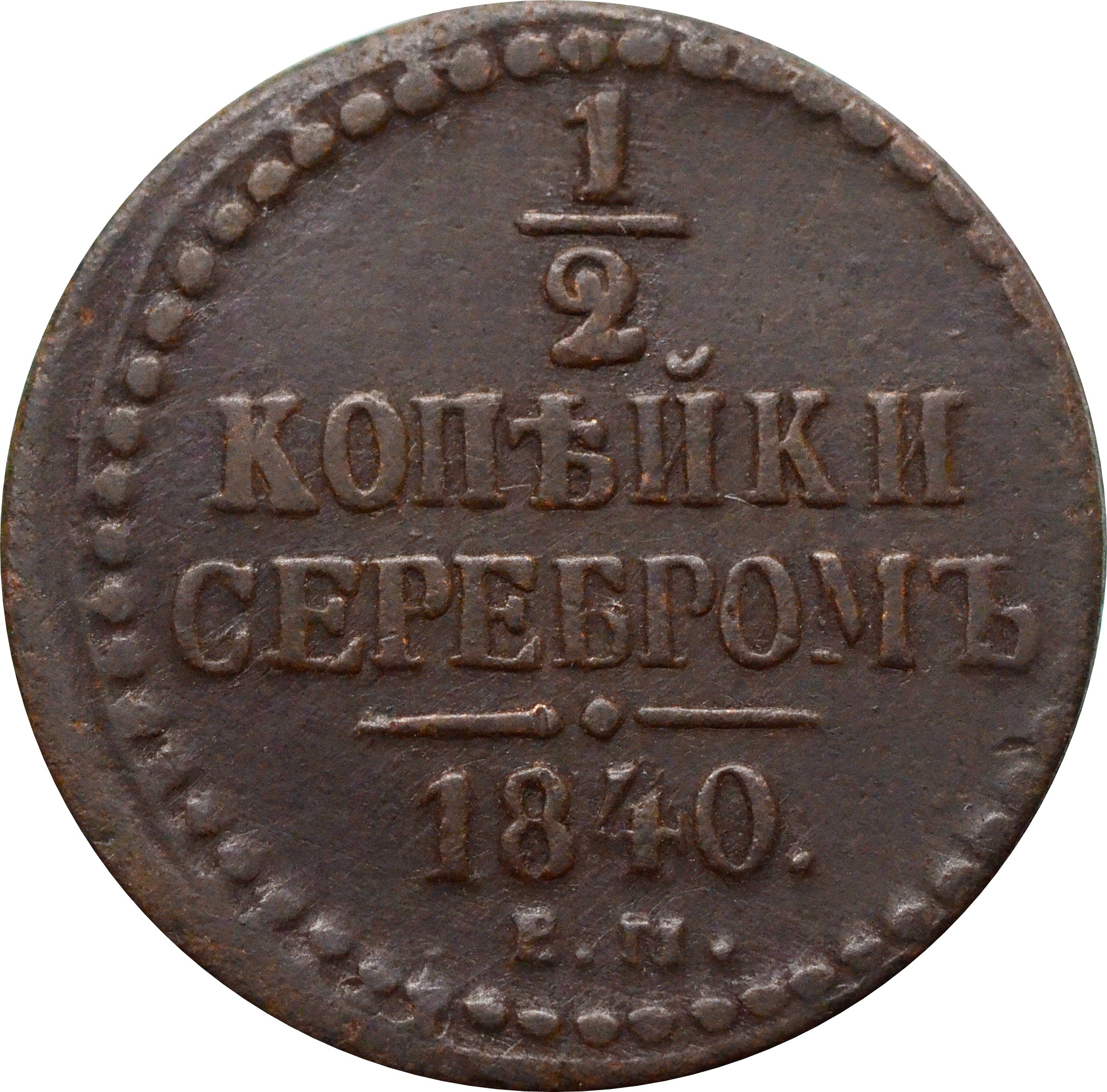 Реверс: по центру указан номинал в три строки: "1/2 КОПѢЙКИ СЕРЕБРОМЪ". Под надписью расположен декоративный разделитель в виде двух фигурных линий и небольшой точки между ними. Под разделителем указан год чеканки монеты: "1840" и обозначение монетного двора — буквы "Е.М.". По окружности канта имеются рельефные элементы, выполненные в виде точек.