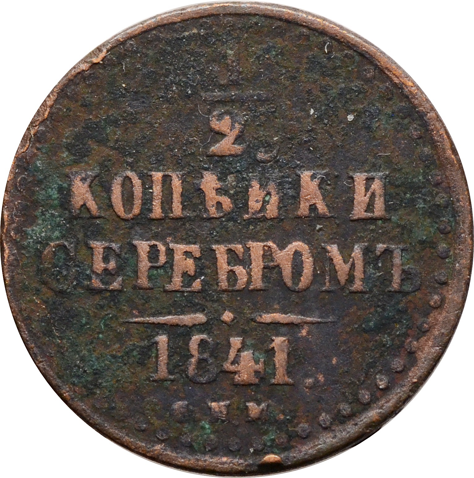 Реверс: по центру указан номинал в три строки: "1/2 КОПѢЙКИ СЕРЕБРОМЪ". Под надписью расположен декоративный разделитель в виде двух фигурных линий и небольшой точки между ними. Под разделителем указан год чеканки монеты: "1841" и обозначение монетного двора — буквы "С.П.М.". По окружности канта имеются рельефные элементы, выполненные в виде точек.