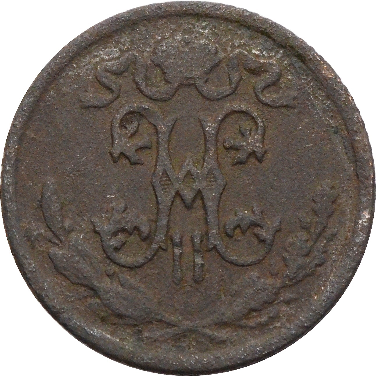 Аверс: в центре вензель императора - Николая II, с короной Российской империи сверху, стилизованной двумя развевающимися концами ленты Ордена Святого апостола Андрея Первозванного. Под вензелем, две скрещенные ветви: слева лавровая, справа дубовая