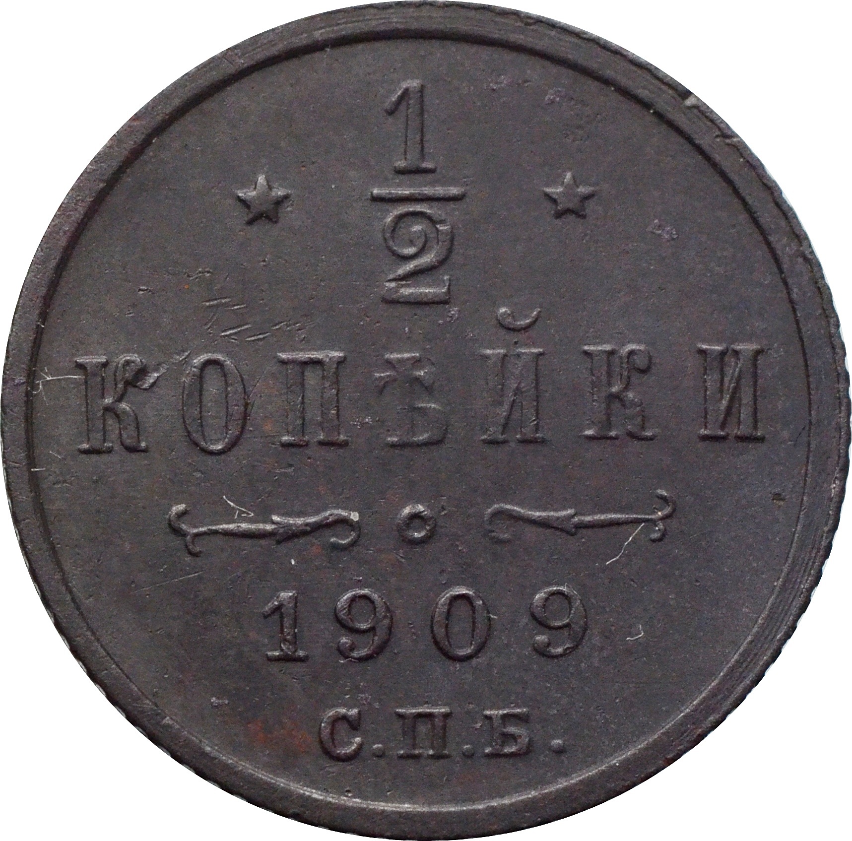 Реверс: по центру указан номинал - цифра "1/2". Под цифрой номинала слово — "КОПЪЙКИ". Ниже, расположен декоративный разделитель в виде двух изогнутых линий и небольшой окружности между ними. Под линиями год чеканки монеты: "1909" и обозначение монетного двора: "С.П.Б.".