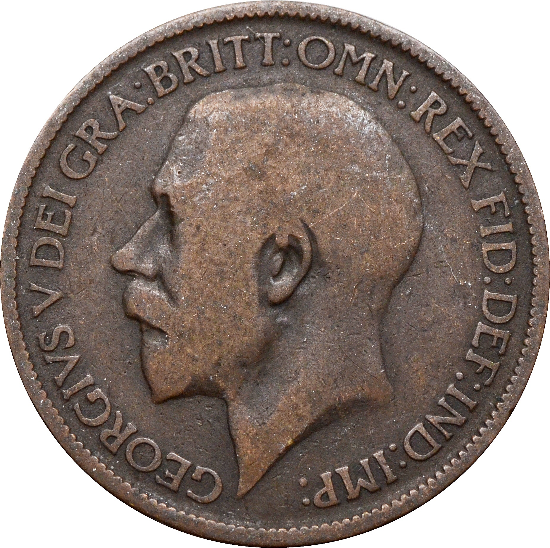 Аверс: в центре монеты изображен портрет короля Георга V. Вдоль канта монеты надпись: "GEORGIVS V DEI GRA:BRITT:OMN:REX FID:DEF:IND:IMP:".
