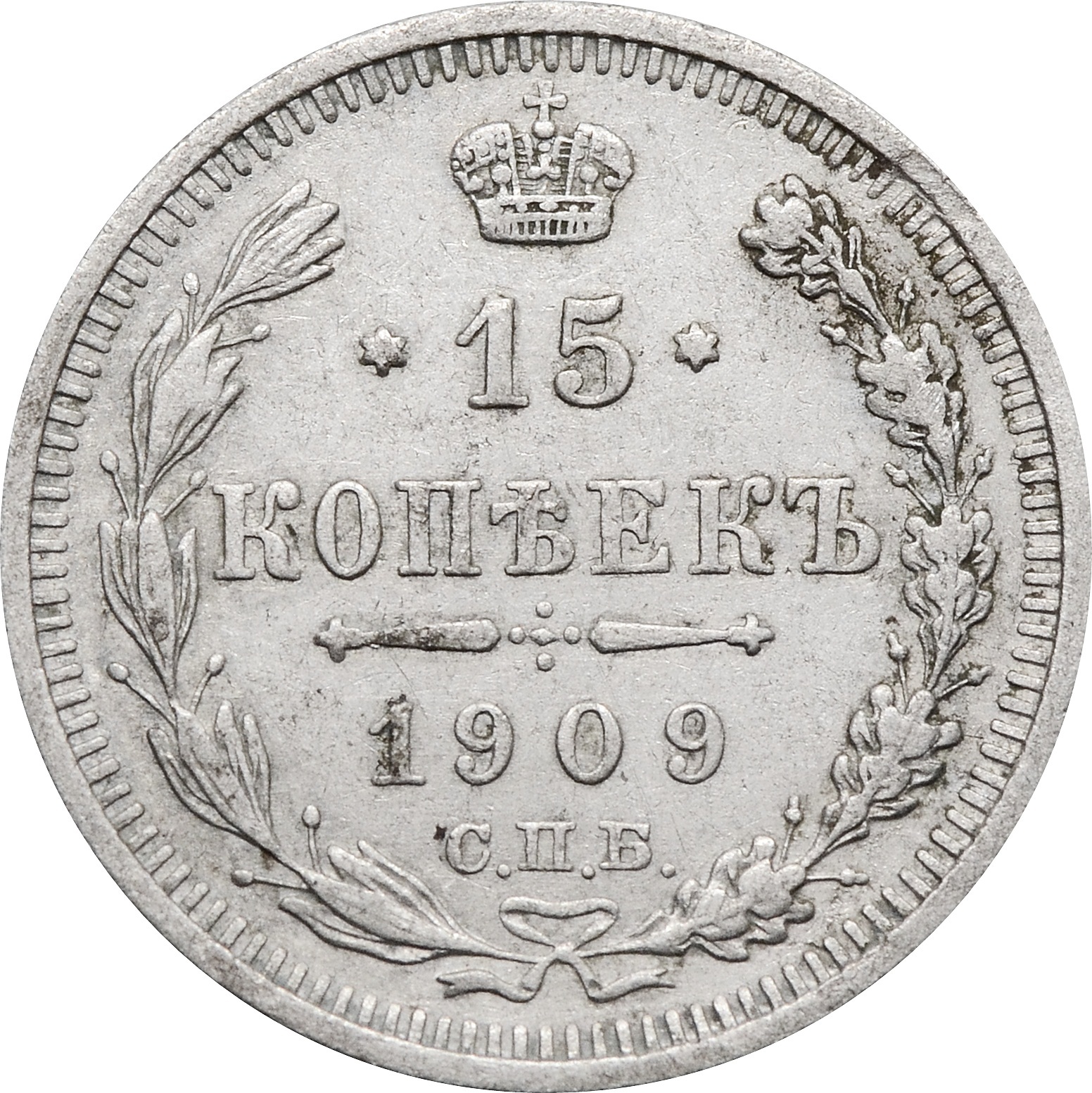 Реверс: по центру указан номинал: "15 КОПЕЕК". Ниже, расположен декоративный разделитель в виде двух разнонаправленных фигурных линий и стилизованным из точек крестом между ними. Под разделителем год чеканки монеты: "1909". Под датой указаны буквы - "СПБ". Вдоль канта, изображен венок из лавровой и дубовой ветвей, которые, перевязаны лентой снизу.