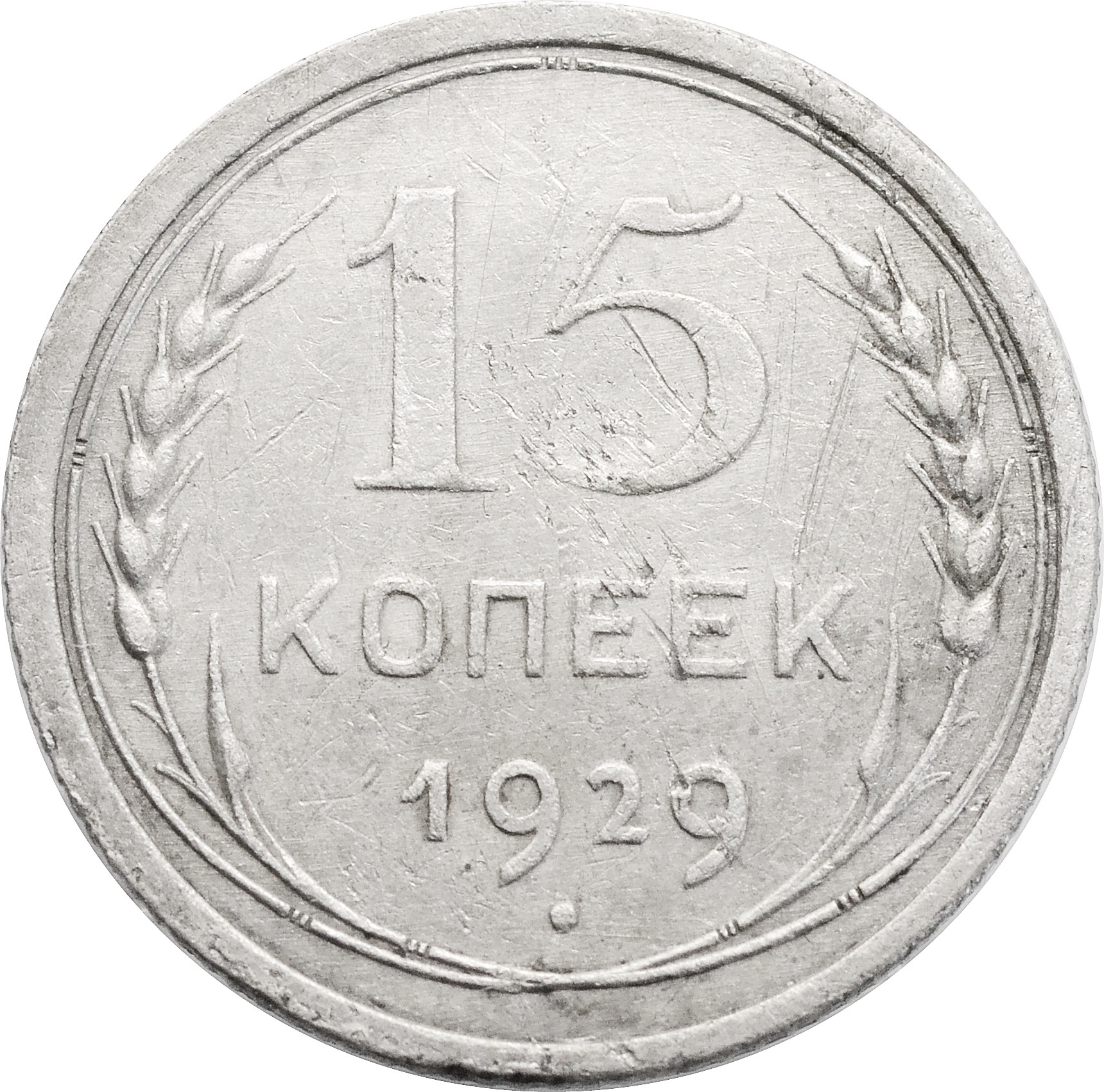 Реверс: по центру монеты указан номинал в две строки: "15 копеек". Сразу под номиналом размещен год чеканки: "1929". Справа и слева, снизу вверх, вдоль канта монеты, два пересекающихся между собой колоса.