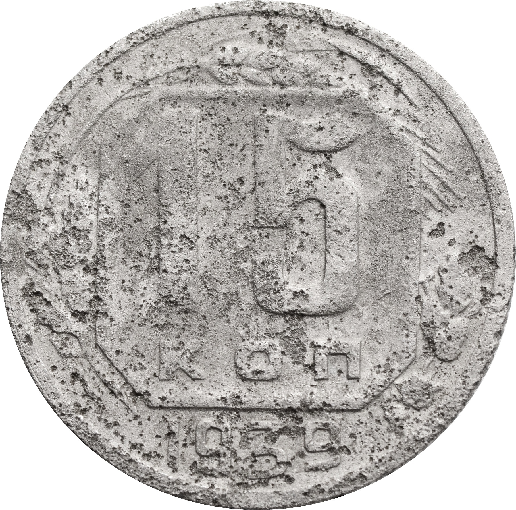 Реверс: чуть выше центра монеты указан номинал в две строки: "15 КОП", ниже расположен год чеканки: "1939".