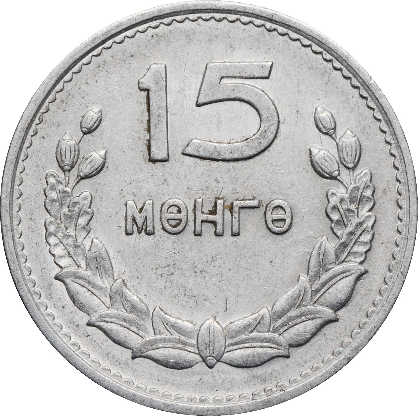 Реверс: в центре монеты указан номинал: "15 МЕНГӨ", ниже стилизованный венок, идущий вдоль канта.